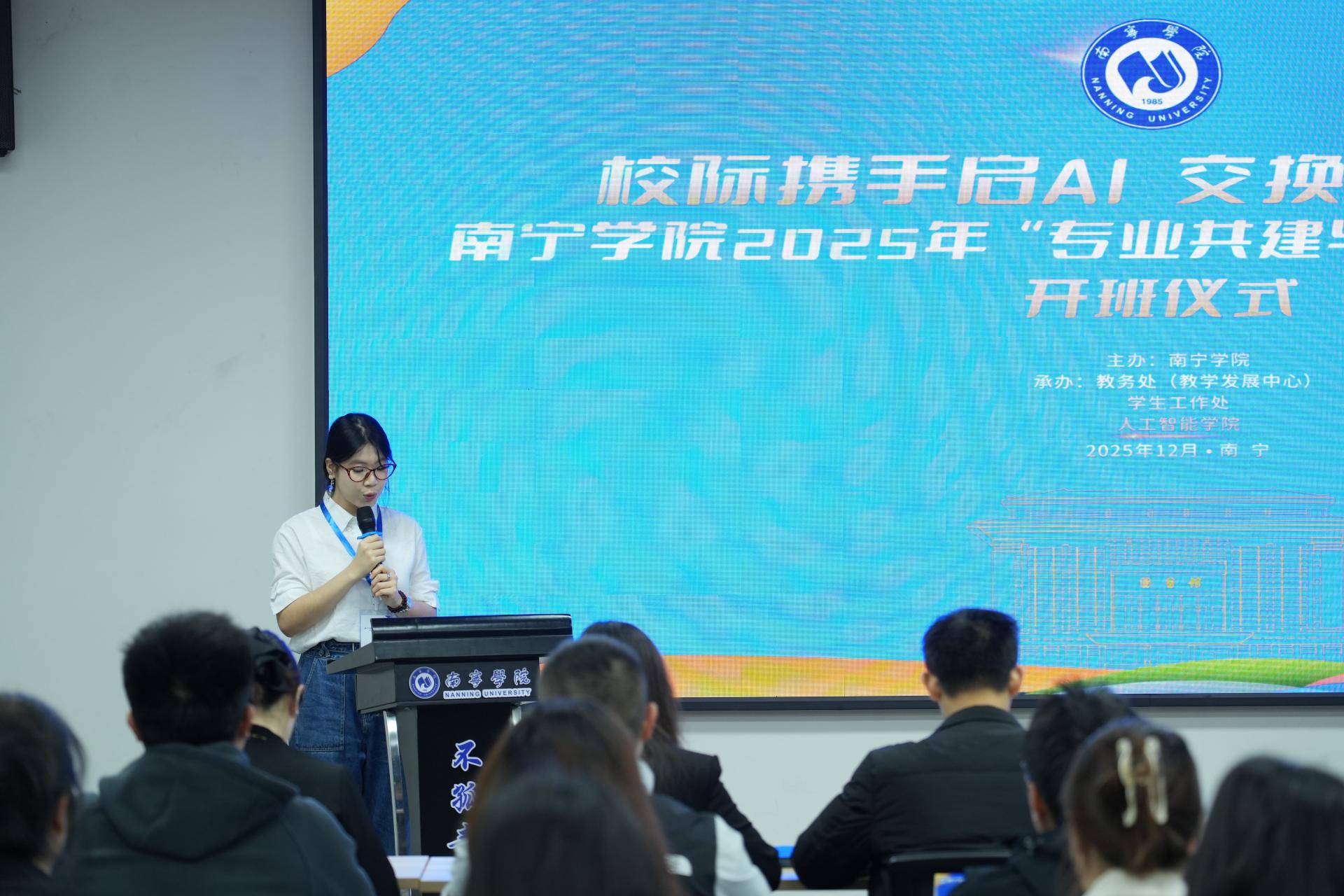 12月16日上午,南宁学院2025年“专业共建与实践交流”活动开班仪式在活动中心202室顺利举行。此次活动由南宁学院主办,教务处(教师发展中心)、学工处、人工智能学院联合承办,旨在通过跨校合作深化专业建设与产教融合创新。重庆人文科技学院领导、教师代表及30名交换生,与南宁学院副校长王宁章、相关职能部门负责人、人工智能学院、华为数字技术产业学院领导及教师代表共同出席仪式,共话协同育人新路径。