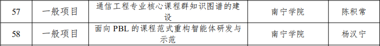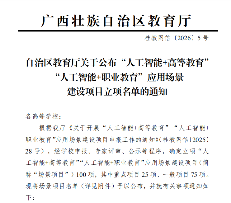 近日,广西壮族自治区教育厅公布了“人工智能+高等教育”“人工智能+职业教育”应用场景建设项目的立项名单,南宁学院信息工程学院陈积常、教务处杨汉宁两位老师主持的项目成功获得立项。