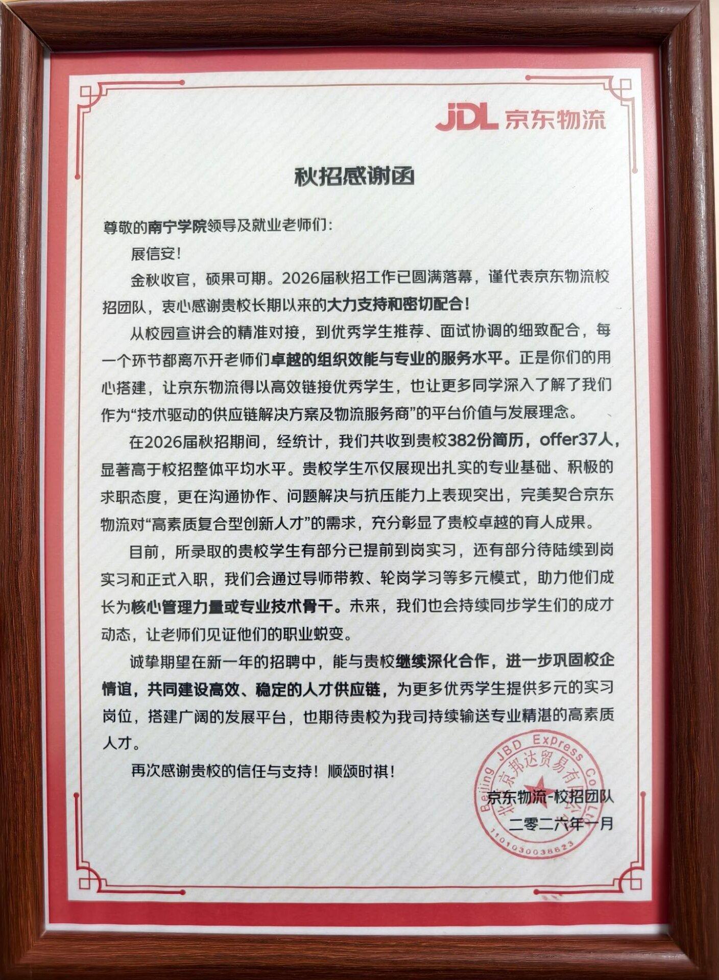 近日,京东物流校招团队向南宁学院交通运输学院发来感谢函,对学院在2026届秋季校园招聘工作中给予的大力支持与密切配合表示衷心感谢,并高度赞扬学院学子扎实的专业素养与优秀的综合能力。本次秋招由交通运输学院具体组织实施,物流工程教研室全体教师全程参与、悉心指导,为学子顺利入职优质企业提供了坚实保障。