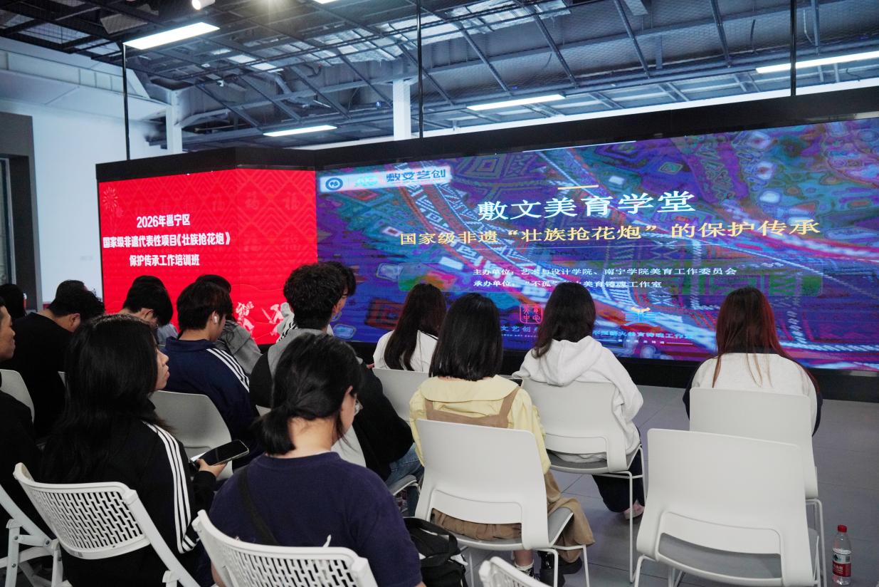 为深入贯彻党的二十大和二十届历次全会精神,全面落实习近平总书记关于非遗保护工作的重要指示精神,扎实推进国家级非物质文化遗产代表性项目壮族抢花炮活态传承,培育青年传承力量,3月17日下午,学校美育工作委员会、艺术与设计学院与邕宁区文化馆在敷文艺创美育中心共同开展敷文美育学堂,开展国家级壮族抢花炮保护传承专题培训班。该活动由区级辅导员工作室“不孤”薪火美育工作室承办。