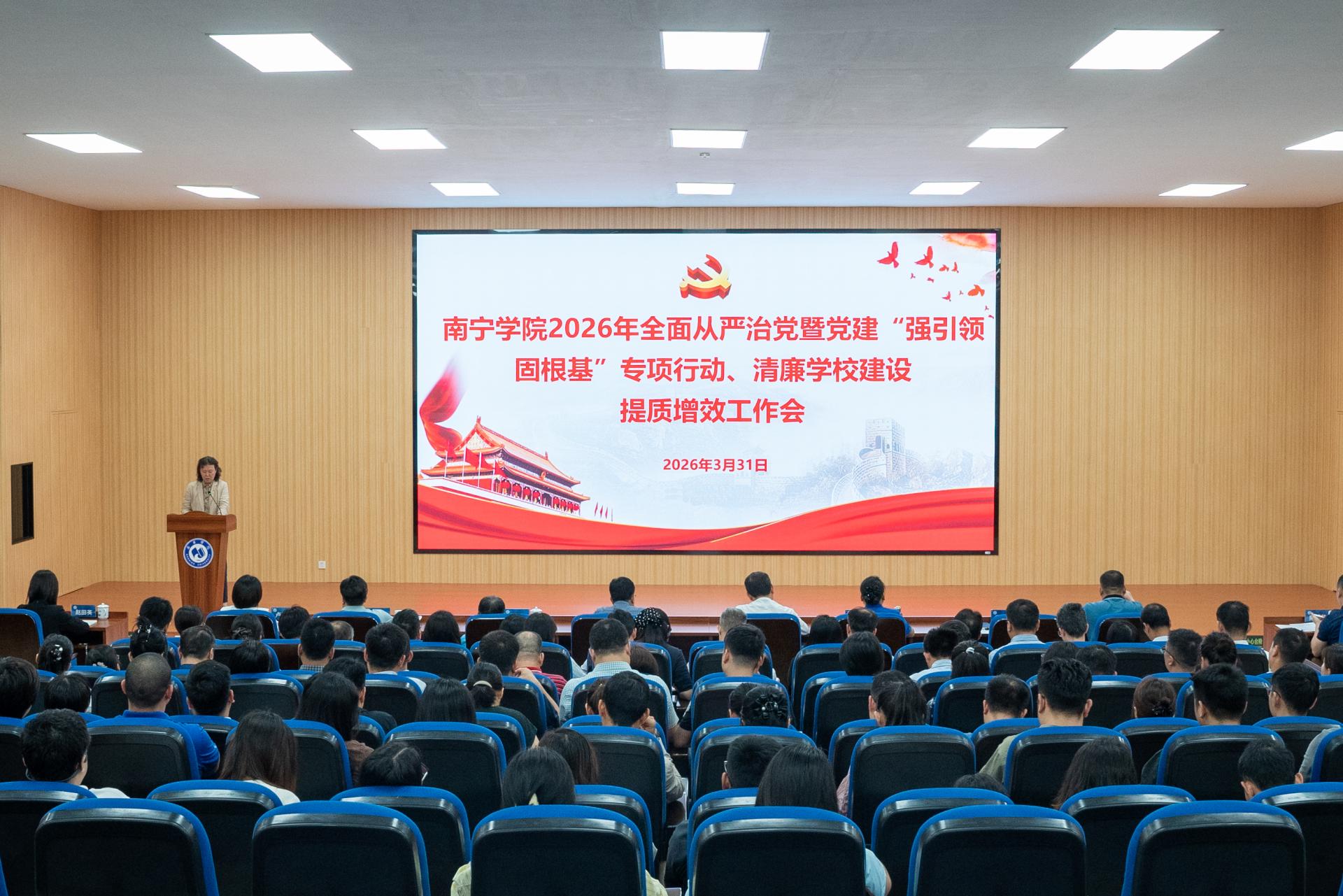 3月31日下午,南宁学院召开2026年全面从严治党暨党建“强引领 固根基”专项行动、清廉学校建设提质增效工作会,深入学习贯彻党的二十大和二十届历次全会精神,全面落实自治区十二届纪委六次全会、2026年全区教育系统全面从严治党暨清廉学校建设提质增效工作视频会议及全区学校党建“强引领 固根基”专项行动会议精神,总结学校全面从严治党和清廉学校建设工作成效,部署2026年重点任务,动员全校各级党组织和广大党员干部进一步统一思想、压实责任、狠抓落实,为学校高质量发展筑牢政治根基、提供纪律保障。全体校领导、二级单位党政负责人、二级学院党委(党总支)副书记及全体教工、学生党支部书记参加会议。会议由校党委副书记、副校长韦粤桂主持。