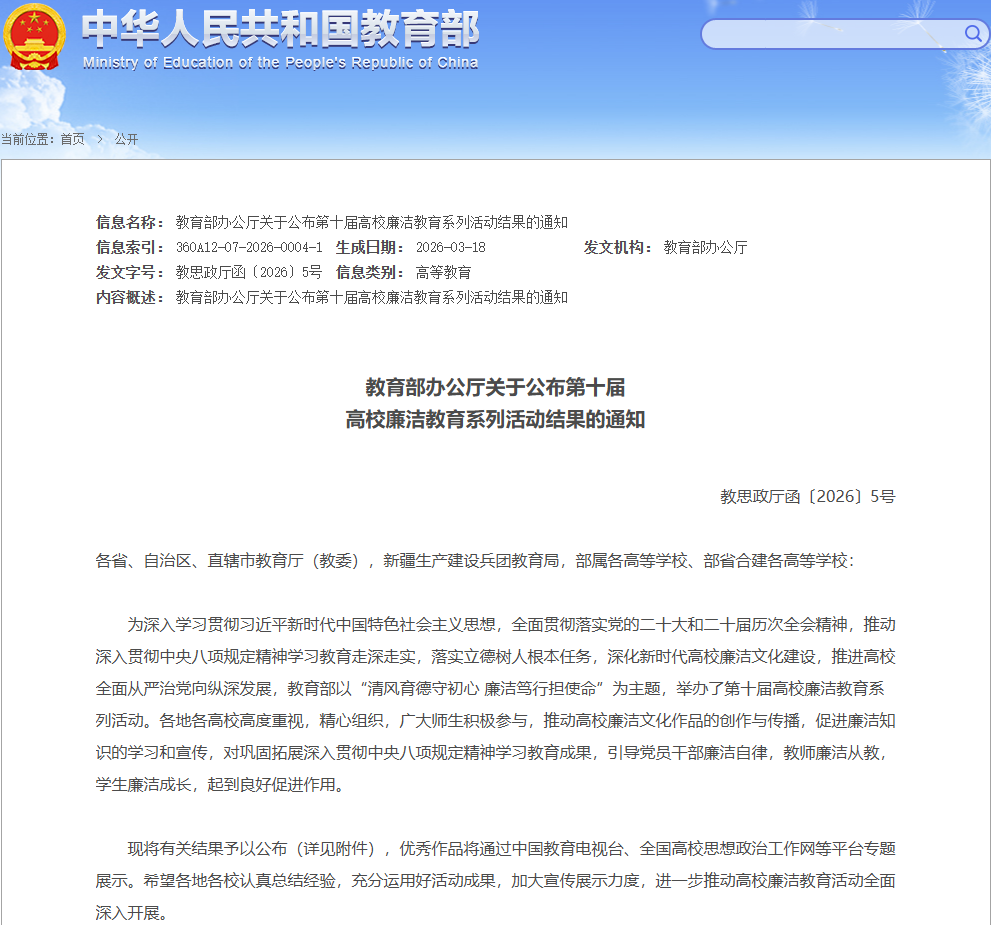 据悉,教育部第十届高校廉洁教育系列活动以“清风育德守初心 廉洁笃行担使命”为主题,围绕“学廉知廉、思廉传廉、践廉守廉”三大主线开展。我校紧扣清廉学校建设要求,精心组织师生参与,经层层推荐与专家评审,最终2件作品从全国高校作品中脱颖而出,生动体现了我校“六廉并举”的扎实成效。