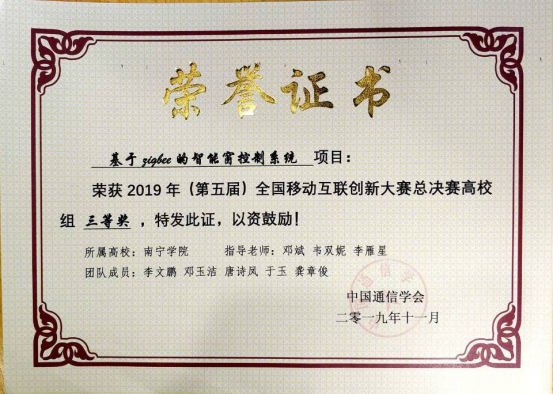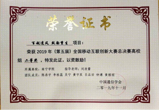 11月17日,由国家工业和信息化部、信息技术新工科产学研联盟指导,中国通信学会、全国移动互联网产业孵化中心主办的2019全国移动互联创新大赛全国总决赛在北京落下帷幕由南宁学院信息工程学院选派的参赛团队晋级总决赛的3个参赛项目分别斩获二等奖2项、三等奖1项的好成绩。
