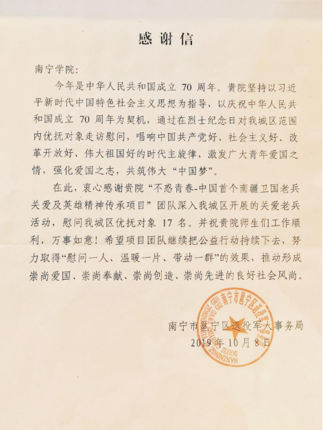 不惑青春团队慰问邕宁区老兵的公益行动得到了邕宁区退役军人事务局的大力支持,并获得该局送上的感谢信,这也是不惑青春团队收到的第四封来自政府部门的感谢信。该局领导表示:“我们非常感谢南宁学院不惑青春公益项目团队,他们做了一件非常有意义的事。希望这项有意义的活动能继续办下去,向更多的卫国老兵表达敬意。”