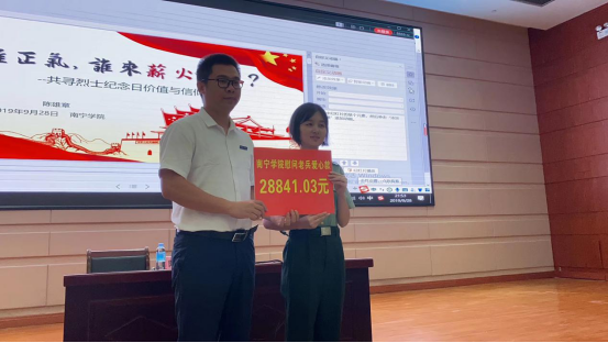 在讲座上,不惑青春公益项目团队收到了来自全校学生向老兵捐赠的爱心款28841.03元。并在之后的时间里,陆续收到学校已毕业的爱心校友捐款共计77300元。