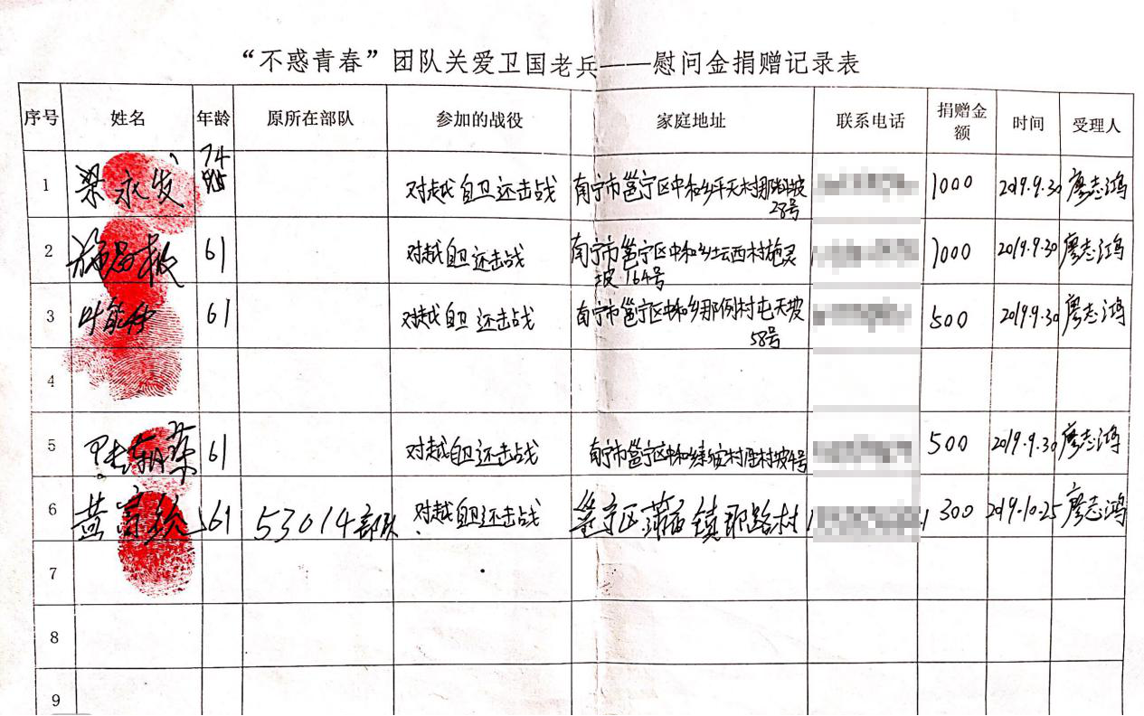 不惑青春团队带着全体南院人的爱,在今年的10月——11月期间集中开展关爱老兵的公益行动,共走访慰问了17位南宁市邕宁区生活困难老兵及1位桂林患重病的老兵。同学们每到一位老兵的家里,都仔细询问了老兵的身体、家庭情况,与老兵亲切交谈,倾听他们讲述当年英勇卫国的事迹。