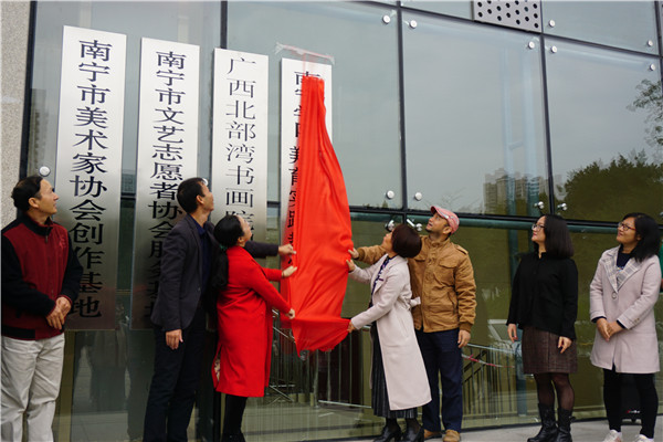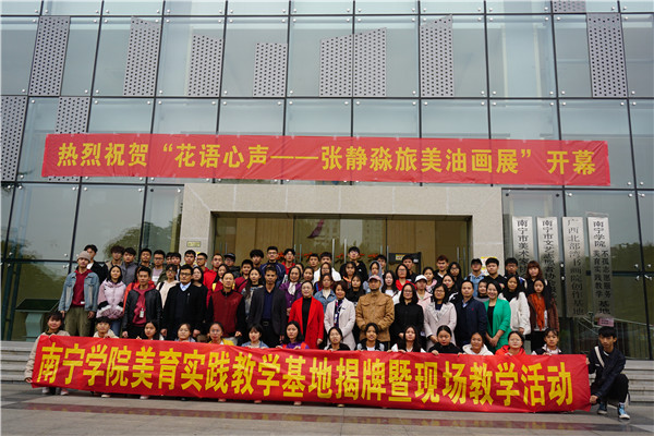 2019年11月29日上午,学校与南宁市群众艺术馆共建的美育实践教学基地和不孤志愿服务基地的揭牌仪式在南宁市群众艺术馆一楼举行。南宁市群众艺术馆副馆长赵岚、韦伟斌,文艺部主任梁鸿,美术部副主任熊海容,调研部副主任虞坤,办公室副主任曾利斌;学校学生工作处处长李林伟,通识教育学院院长杨小凤、副院长蓝志军等80余名师生代表出席揭牌仪式。