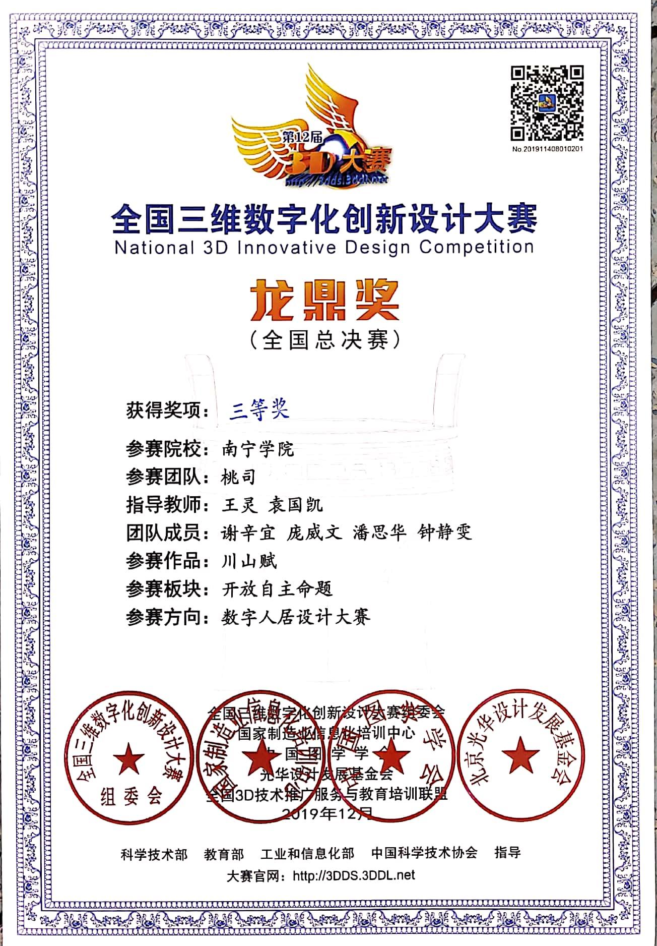 2019年12月6日-9日,第12届全国三维数字创新设计大赛(大学生组)年度总决赛在云南玉溪隆重举行,艺术设计学院师生参加比赛喜获国赛三等奖的佳绩.