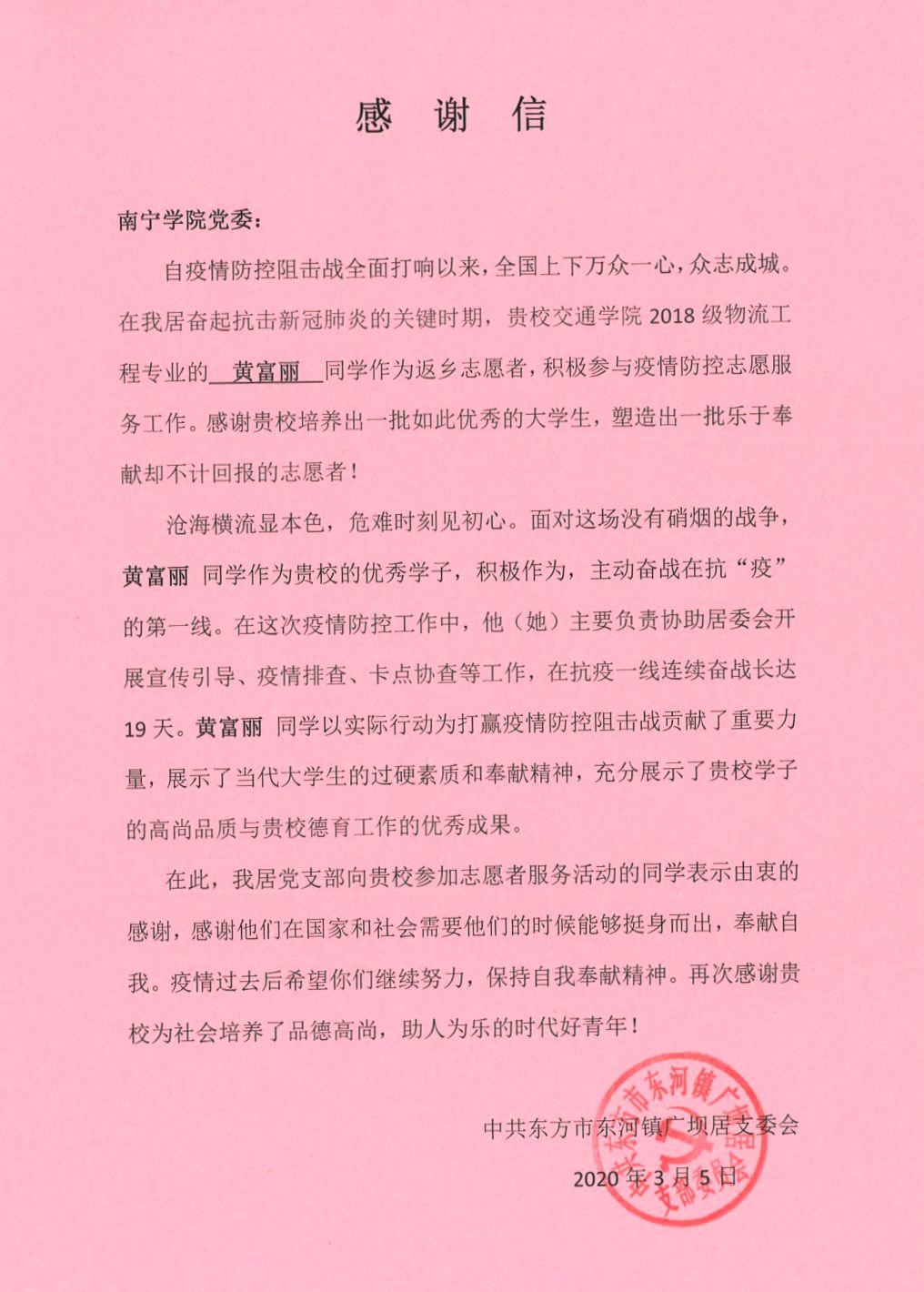 近日,海南省东方市东河镇广坝居支委会向我校发来感谢信,表扬学校交通学院2018级物流工程专业的黄富丽同学,感谢她在返乡期间投入防疫一线,志愿服务,无私奉献。同时高度肯定了学校在人才培养,学生德育取得的成果。
