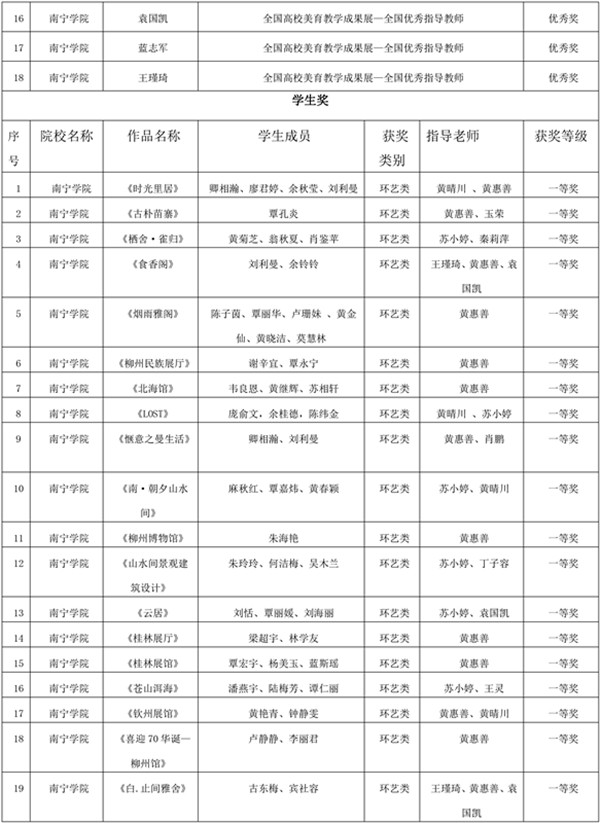 艺术设计学院环境设计专业学生参赛团队在指导教师们(王灵、秦莉萍、袁国凯、蓝志军、玉荣、王瑾琦、黄惠善、丁子容、黄晴川、苏小婷)的精心指导下,积极备赛,经过多翻打磨,高质量地完成了参赛作品。师生参赛作品,通过激烈角逐,最终学生获奖作品一等奖21项,二等奖13项,三等奖4项;教师获奖作品一等奖3项,二等奖2项;优秀指导教师奖10人;南宁学院荣获先进单位1项,南宁学院荣获教学优异成果奖1项的优异成绩。