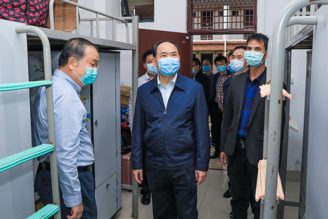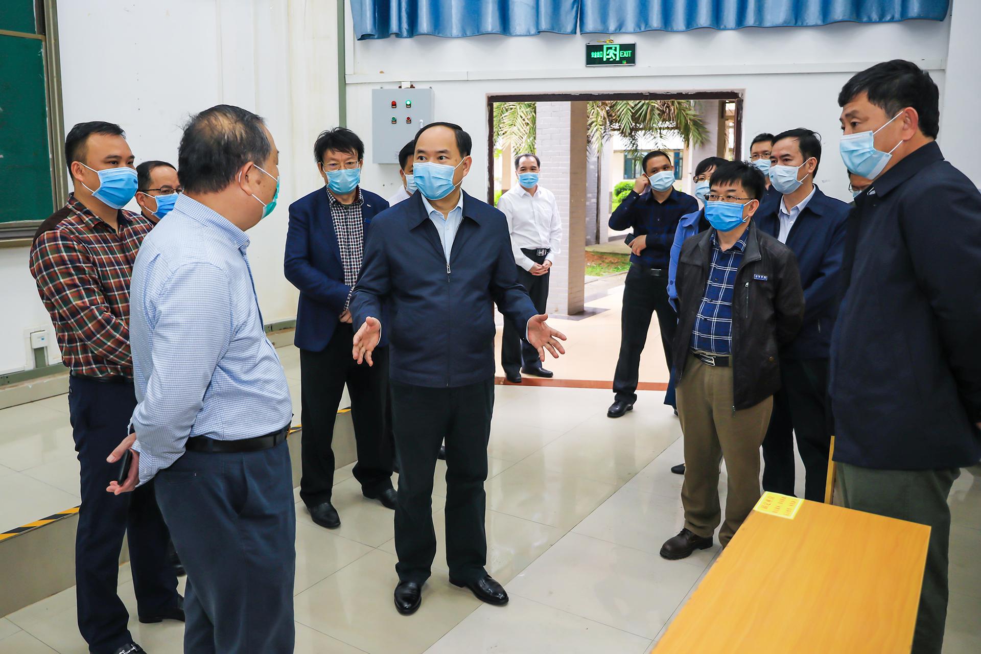 邓亚平同志一行首先在学校南大门检查疫情出入管理设置。随后对敷文园教学楼、学生第一食堂、卧龙岗学生宿舍楼、学校医务室、疫情集中隔离点逐一开展现场检查。详细了解校园封闭管理、疫情应急处置、课堂教学管理、宿舍管理安排、学生食堂就餐及食品安全管控等各重点环节的开学准备工作开展情况。