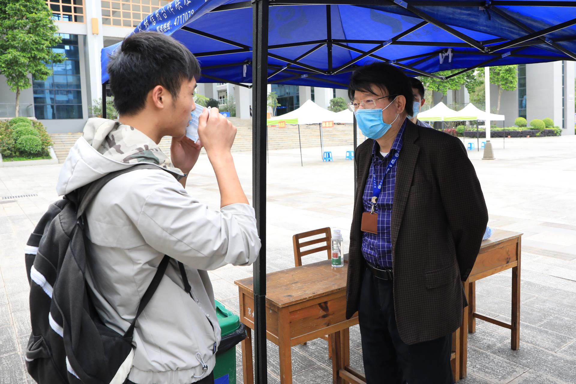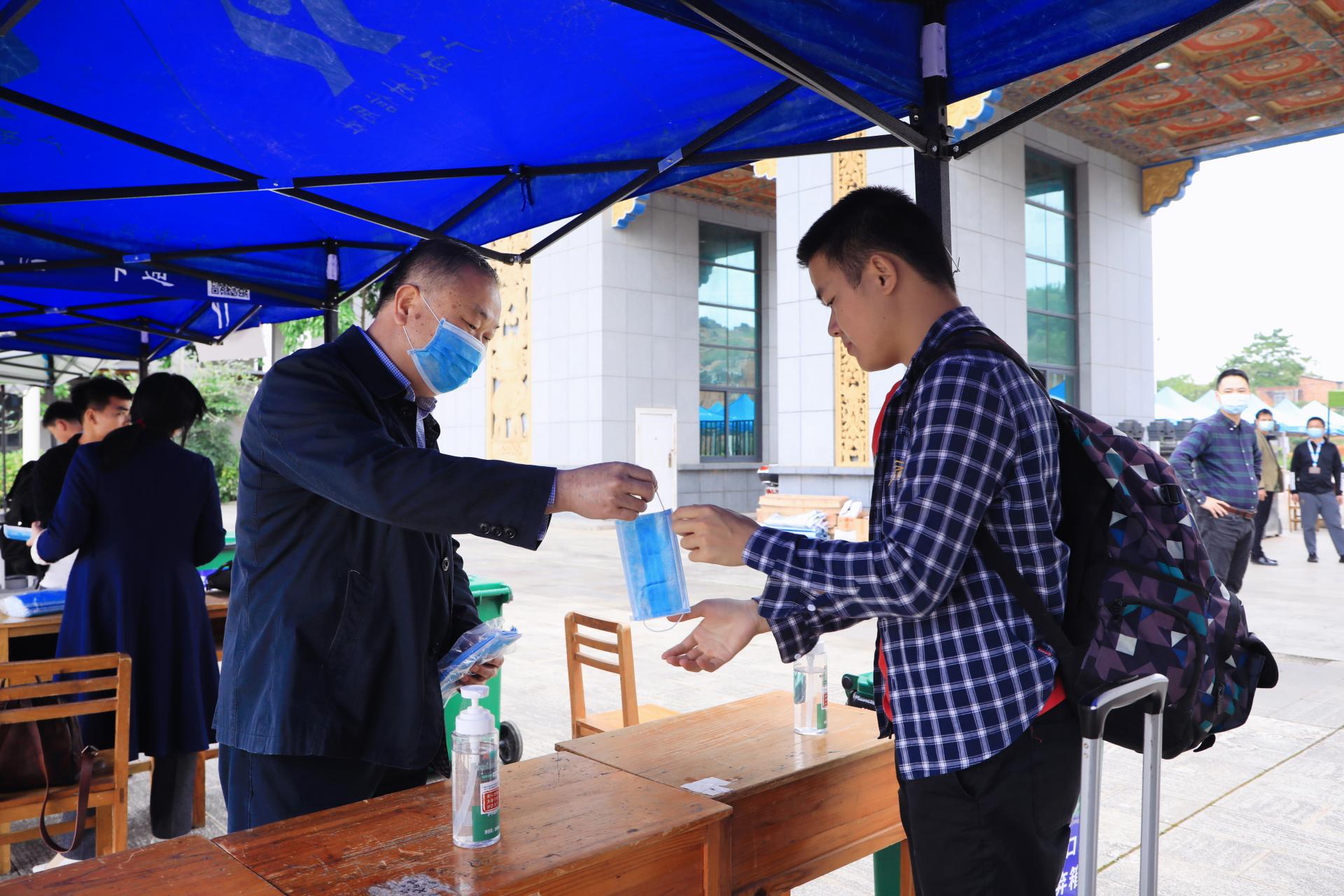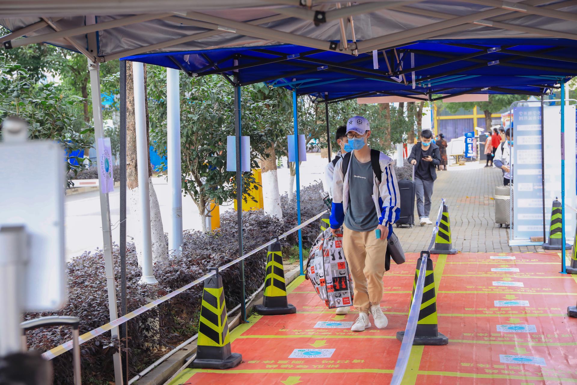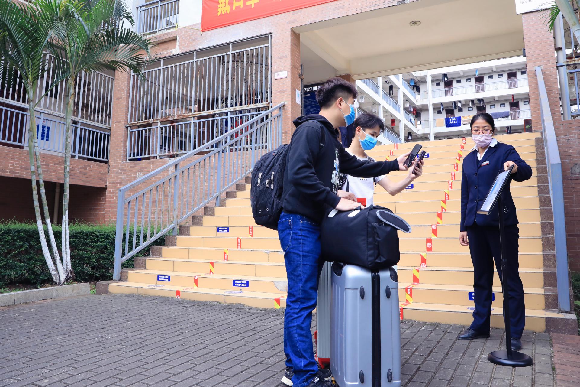 根据返校复学减少接触交通工具的倡议,学校分别在南宁火车站、南宁火车东站、琅东客运站设置了接驳点,安排专车接学生返校。“欢迎同学们返校学习”,在校门入口,返校学生们受到了早早守候在校门口的校领导、老师们的热情迎接。下车的学生在老师们的引导下,大家拉开距离有序排队。经过测温、扫码、洗手、更换口罩、行李消毒、钉钉签到,学生们顺利进入校园。此外,学校还特地增开校内电瓶车接送学生到宿舍。返校学生从进校到宿舍必经的每一个环节,都按照学校新冠肺炎疫情防控应急演练过的程序有条不紊地进行。