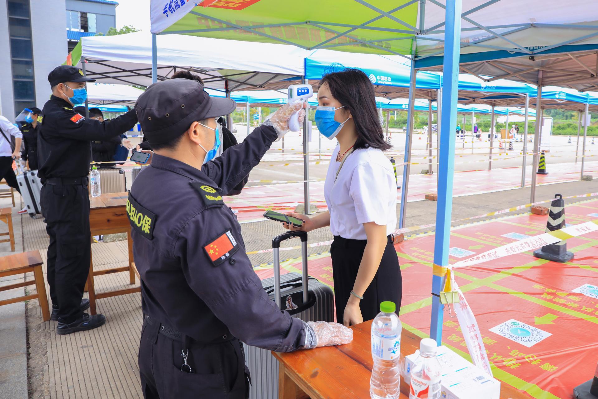 保安人员认真仔细地为每一位返校学生测温