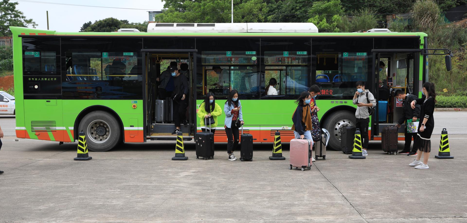 返校学生在老师的带领下前往学校接驳车