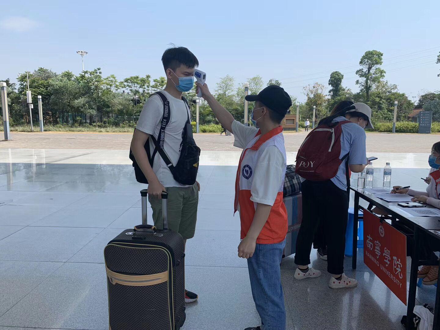 志愿者在接站点为返校学生测量体温