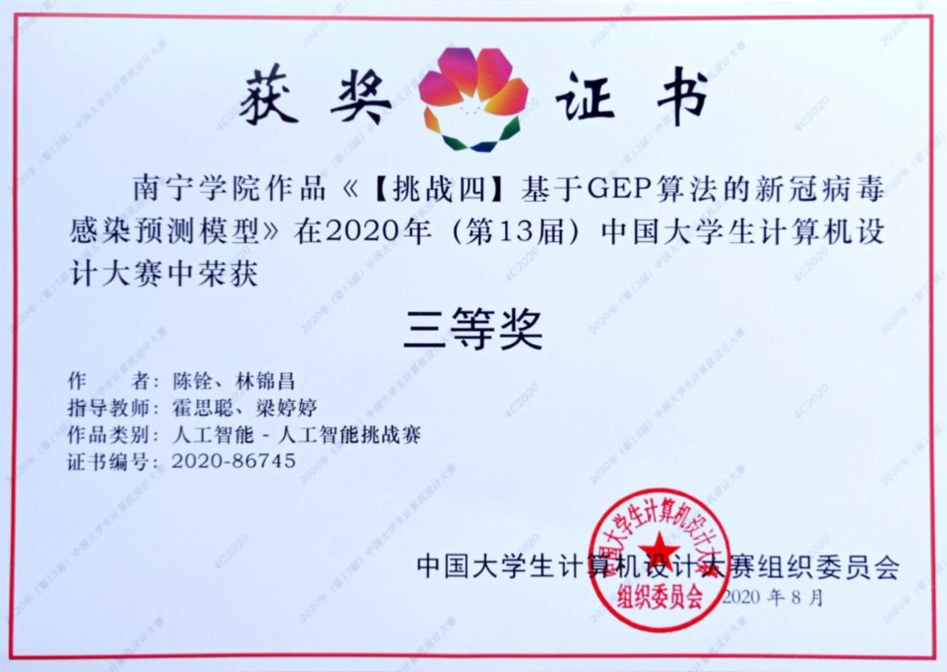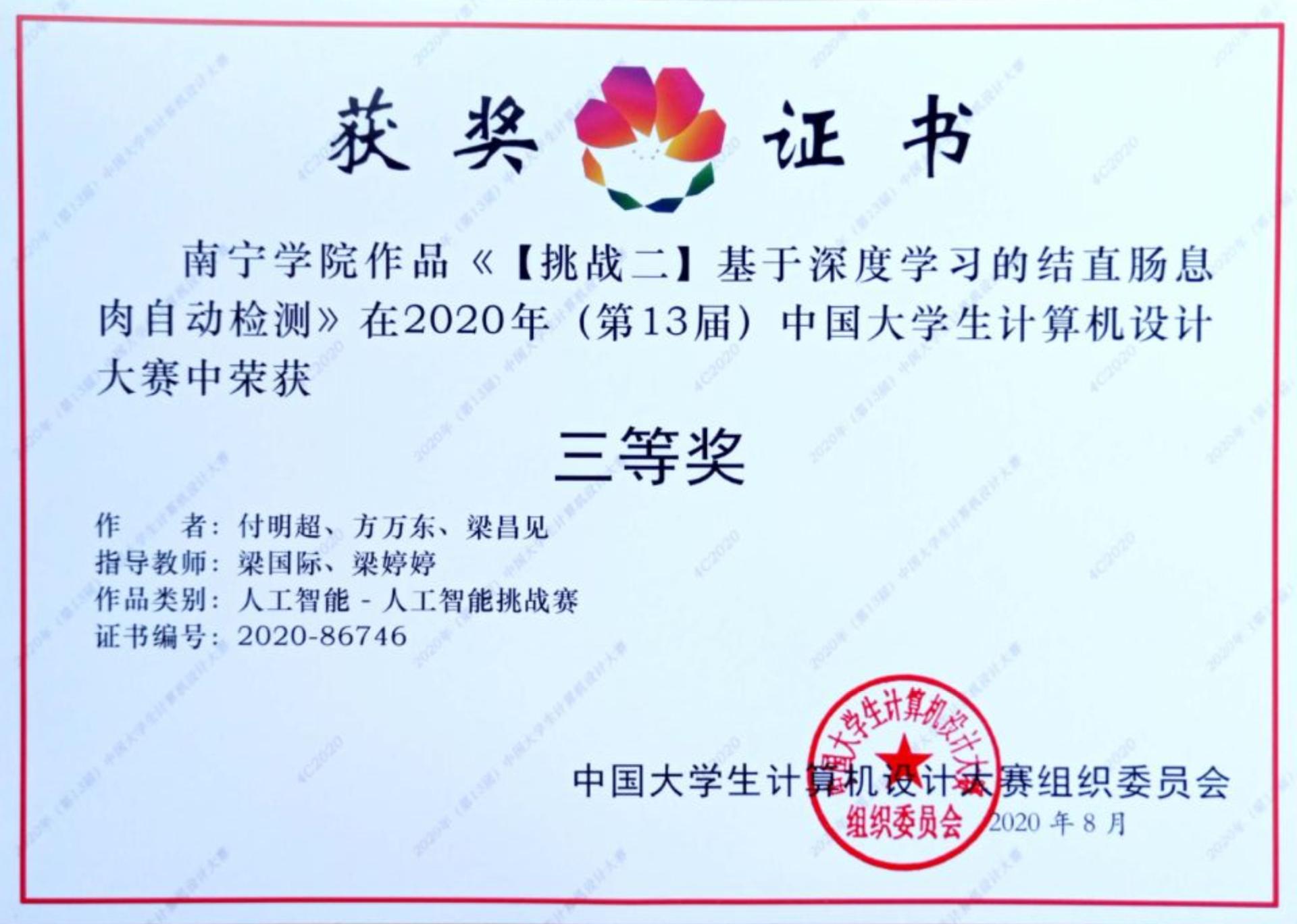 在日前结束的2020年(第13届)中国大学生计算机设计大赛中,南宁学院信息工程学院梁婷婷、霍思聪、梁国际三位老师指导的《基于GEP算法的新冠病毒感染预测模型》、《基于深度学习的结直肠息肉自动检测》两个项目获得该赛事人工智能挑战赛全国决赛三等奖。