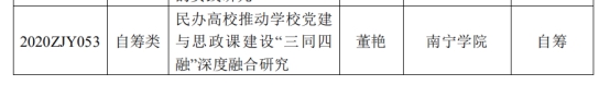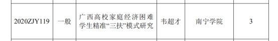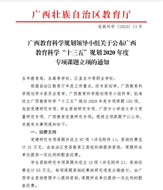 近日,广西教育厅下达了广西教育科学“十三五”规划2020年度专项课题立项通知,经审定,共153课题获得立项包括党建研究专项、学生资助研究专项、广西中小学语文学院质量研究专项和广西教育发展研究专项。其中,学校学工处副处长韦超才作为课题负责人《广西高校贫困家庭学生精准“三扶”模式研究》、马克思主义学院副院长董艳作为课题负责人的《民办高校推动学校党建与思政课建设“三同四融”深度融合研究 》分别获得学生资助研究专项和党建研究专项立项。