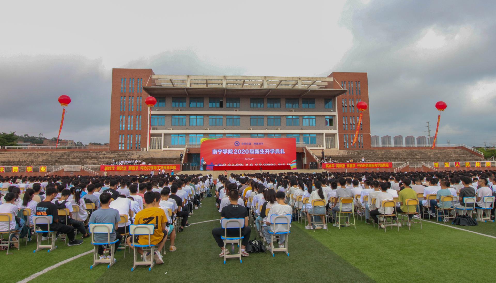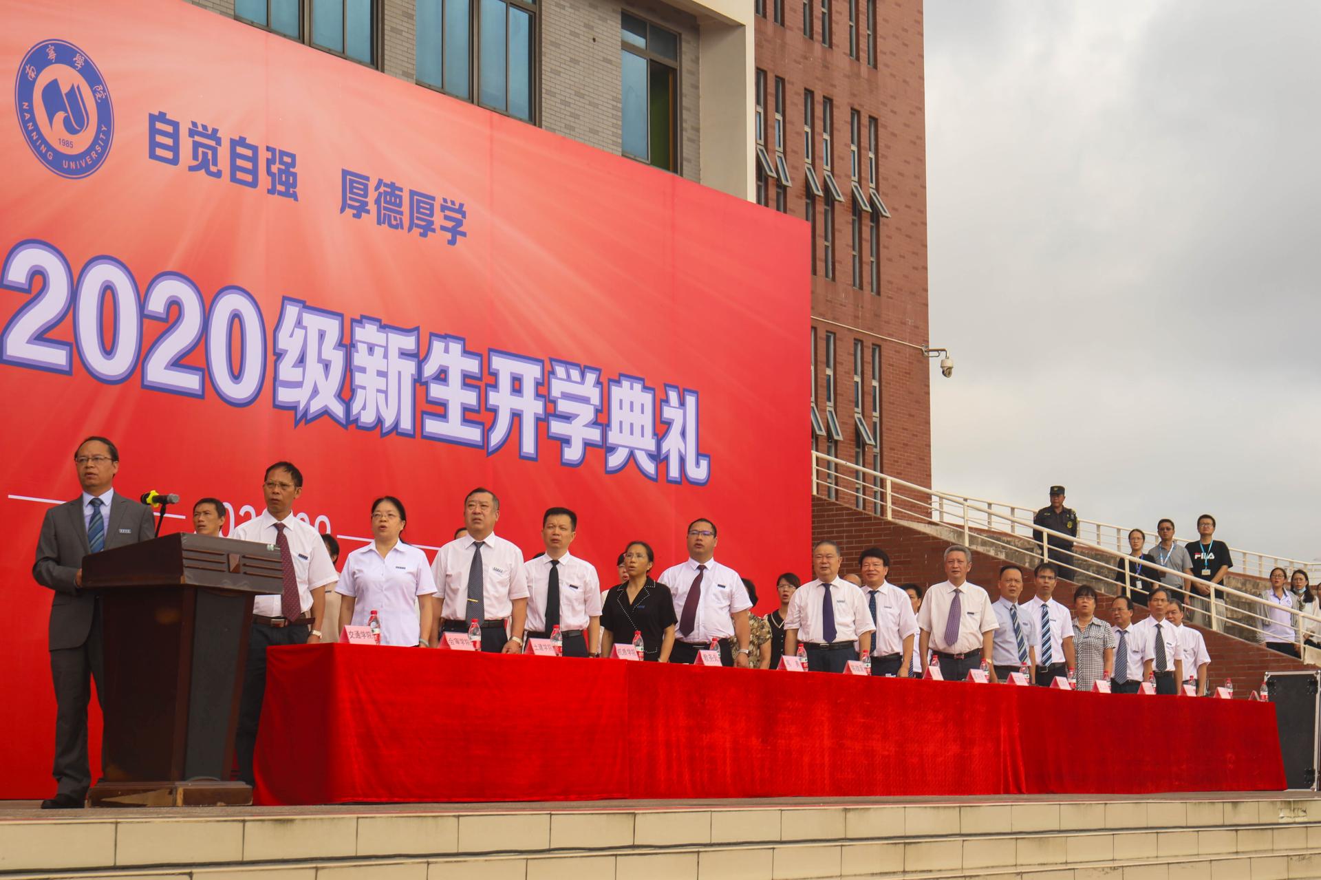 秋分至,硕果累。9月22日,南宁学院在学校田径场举行2020级新生开学典礼。校长赖每,党委副书记、纪委书记覃存民,副校长陈雄章、文旭光,学校财务总监,各二级学院、各处室主要负责人,各学院党总支副书记、学工科科长、新生班辅导员及4000余名新生参加了开学典礼。典礼由陈雄章副校长主持。