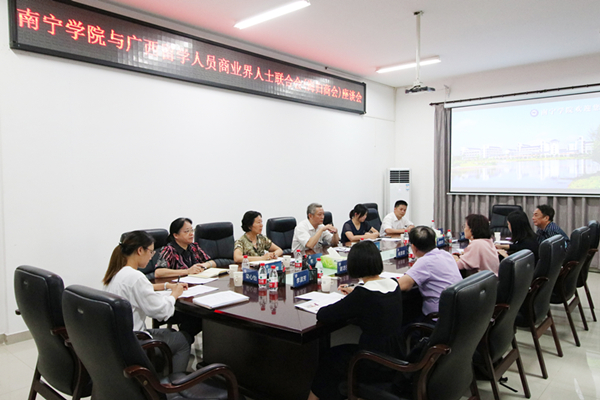 9月22日下午,学校邀请广西留学人员商业界人士联合会(海归商会)执行会长杨慧星、海归商会外联部负责人梁翠芩一行六人来校考察交流,并与副校长文旭光、国际交流处处长韦平及相关二级学院院长进行座谈交流。