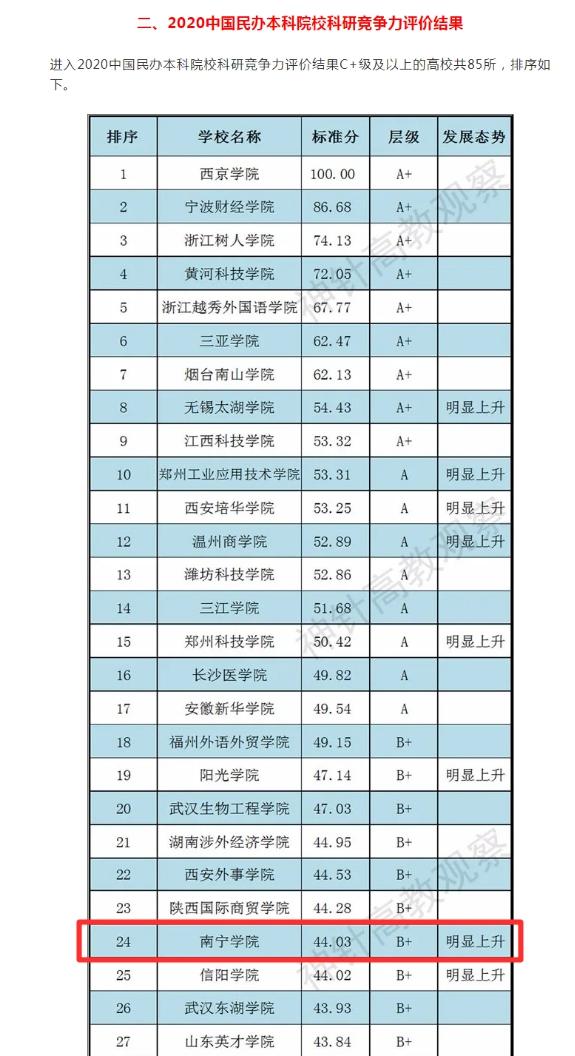 2020中国民办本科院校及独立学院科研竞争力评价研究报告》已于近日正式发布,南宁学院位居2020中国民办本科院校科研竞争力排行榜第24位,获得科研竞争力明显上升的评价!单项分析中,特别提到:获得授权发明专利比较多的民办本科院校则有黄河科技学院、西京学院、南宁学院等。南宁学院标准分是44.03,层级是B+,较上一年排名提升14,发展态势较好