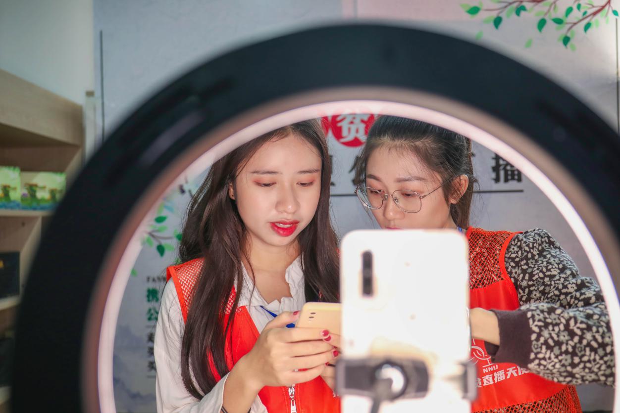 商贸空间在开展“直播带货——助力广西脱贫攻坚最后一公里”活动。同学们穿着“助农天使”的马甲,在直播镜头前熟练地介绍着来自广西各贫困地区的特色产品,提升产品销量,尽个人微薄的力量为了广西脱贫攻坚做贡献。