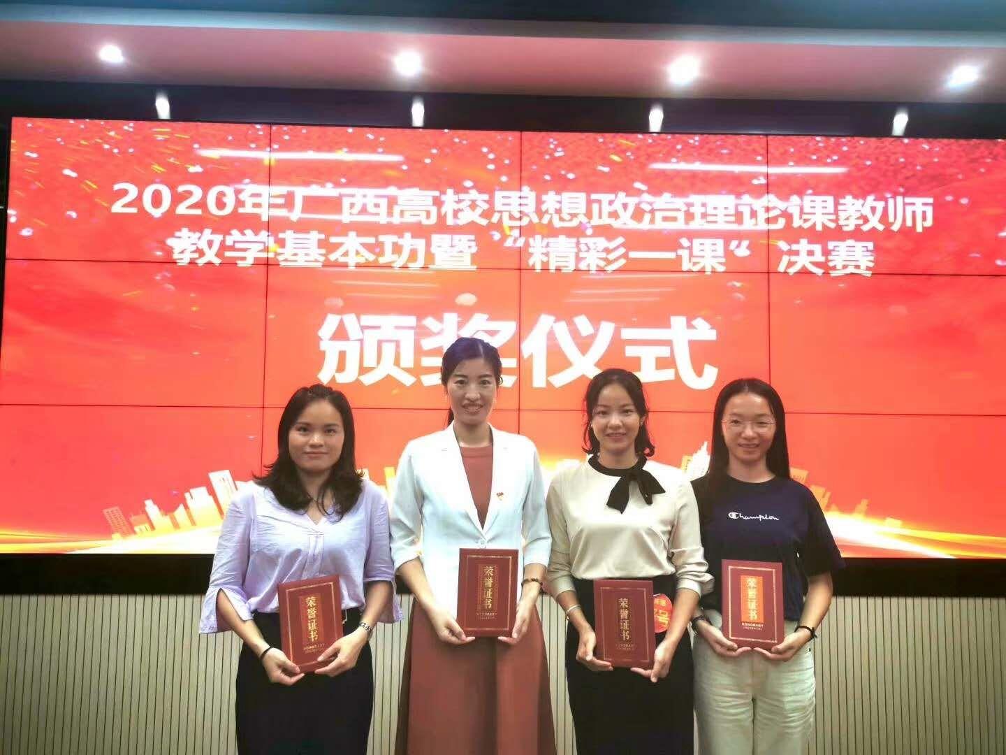 在自治区教育厅刚刚公布的2020年广西高校思想政治理论课教师教学基本功暨“精彩一课”比赛获奖名单中,学校马克思主义学院教师荣获一等奖1名,二等奖1名,三等奖4名,实现了学校参赛思政课教师全部获奖的喜人成绩!