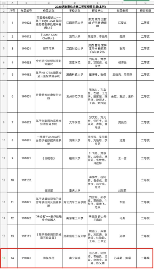 10月28日在澳门举行的“2020泛珠三角+大学生计算机作品赛”总决赛中,学校入围总决赛的两个项目与澳门理工学院、香港城市大学、广东工业大学、华南师范大学、海南大学、西南林业大学、东南大学、重庆科技学院、韶关学院、云林科技大学及台湾海洋大学等高校同台竞技,《御福乡村》项目荣获全国二等奖,《校友圈》项目获全国三等奖。