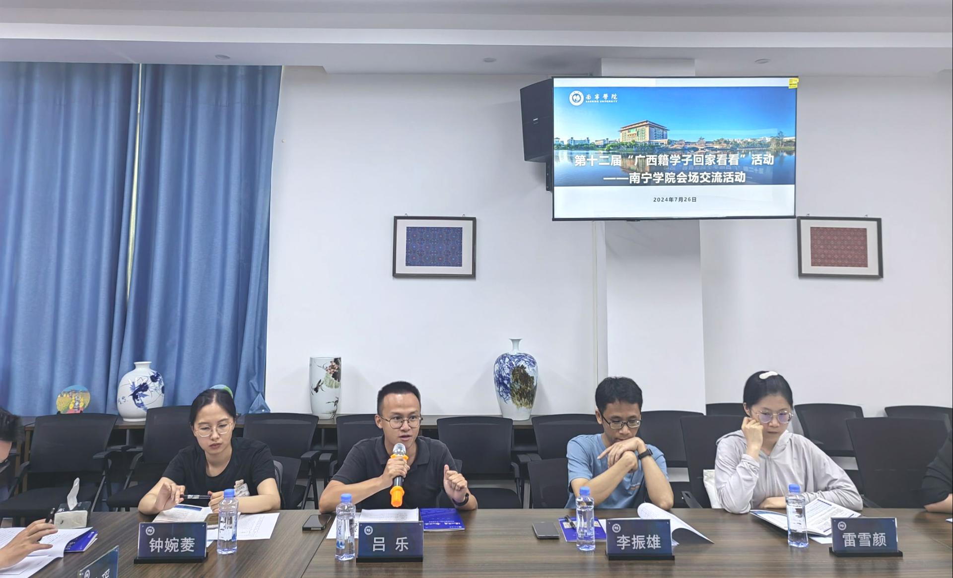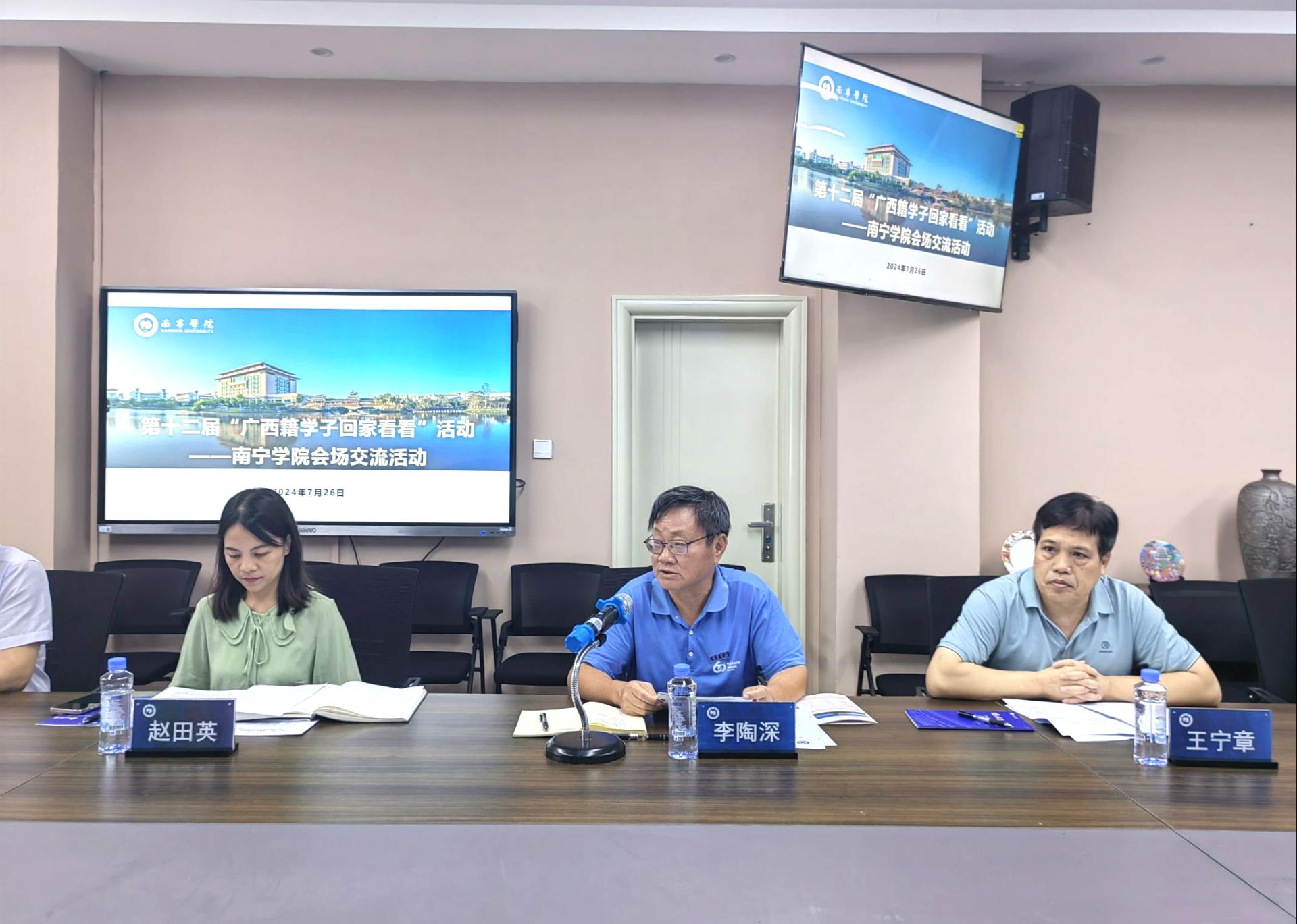 7月26日下午,根据南宁市委组织部、市委宣传部等单位主办的第十二届“广西籍学子回家看看”活动安排,在南宁北部湾人才金港有限公司副总经理魏娜带队下,广西籍博士生代表团共19人到我校参观交流。交流座谈会在综合楼111会议室举行,副校长李陶深、副校长王宁章及人事处、科研与学科建设处、智能制造学院、交通运输学院、商学院等单位负责人出席座谈会。会议由王宁章副校长主持。