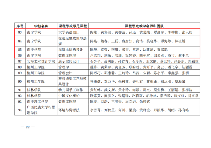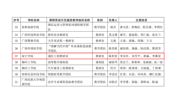 日前,自治区教育厅下发《自治区教育厅关于公布2023年全区高校课程思政示范课程和和课程思政示范基层教学组织名单的通知》(桂教高教〔20243号),南宁学院的《大学英语BⅢ》《交通运输政策与法规》《混凝土结构设计》《数据库原理》4门课程入选自治区级课程思政示范课程,教学团队同时获评为课程思政教学名师和团队,通信工程教研室入选自治区级课程思政示范基层教学组织。