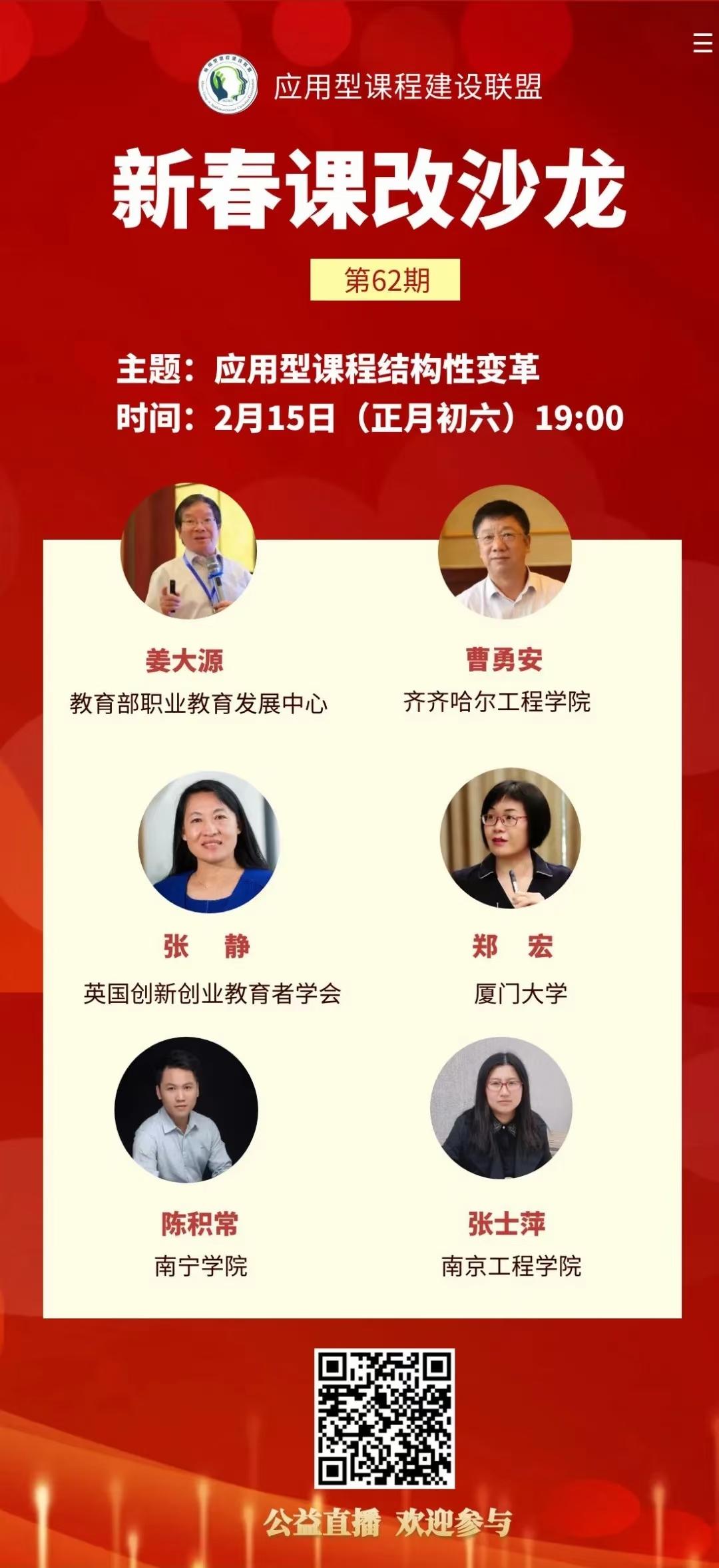2月15日,由教育部学校规划建设发展中心指导、全国应用型课程建设联盟主办的“新春课改沙龙”活动在线上召开,线上参会人数达到5000多人次。本次课改沙龙聚焦“应用型课程结构性变革”主题,邀请教育部职业教育发展中心姜大源教授、齐齐哈尔工程学院曹勇安教授、英国创新创业教育者学会张静研究员、厦门大学郑宏副教授、南京工程学院张士萍教授及我校陈积常教授在会上做课程改革主题报告分享。