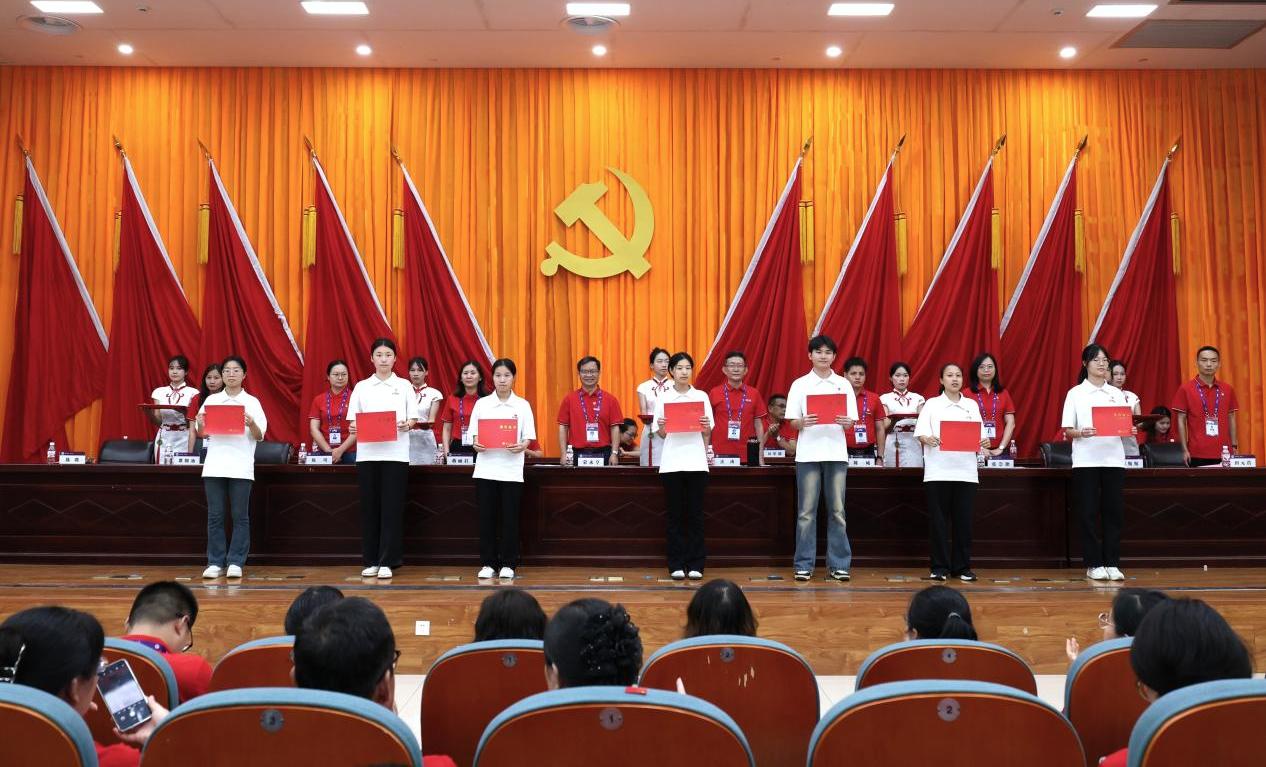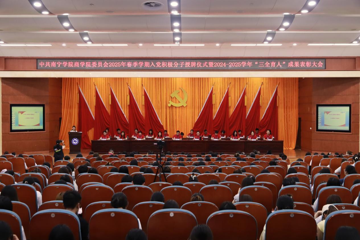 5月20日下午,中共南宁学院商学院委员会在图书馆报告厅举行“融文于商,育人于行——2025年春季学期入党积极分子授牌仪式暨‘三全育人 ’成果表彰大会”。学院党政工领导班子、党委委员、全体教工和学生党员、入党积极分子代表、受表彰学生及提交入党申请书学生代表等550人参加活动。活动由学院党委副书记覃雪莲主持。