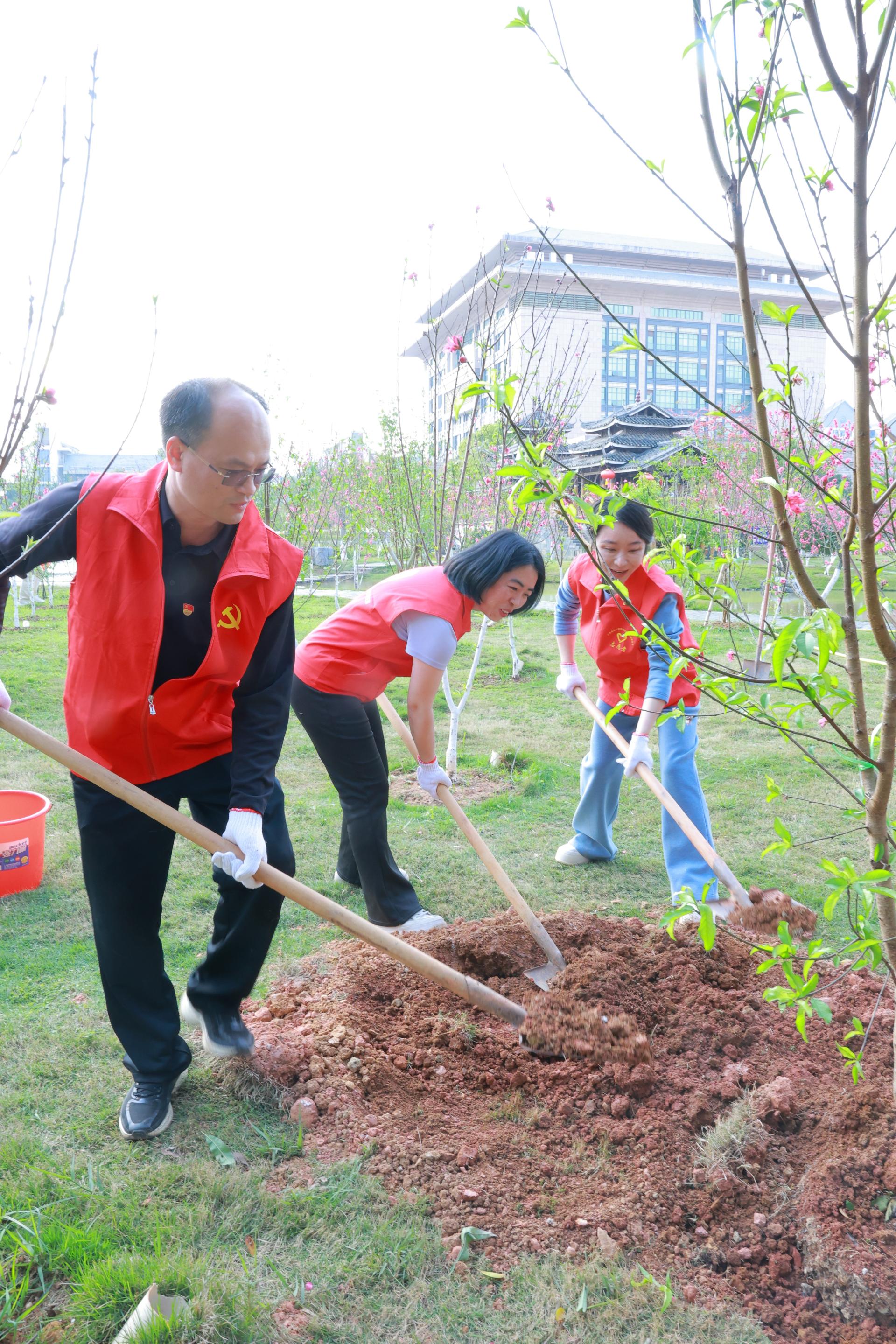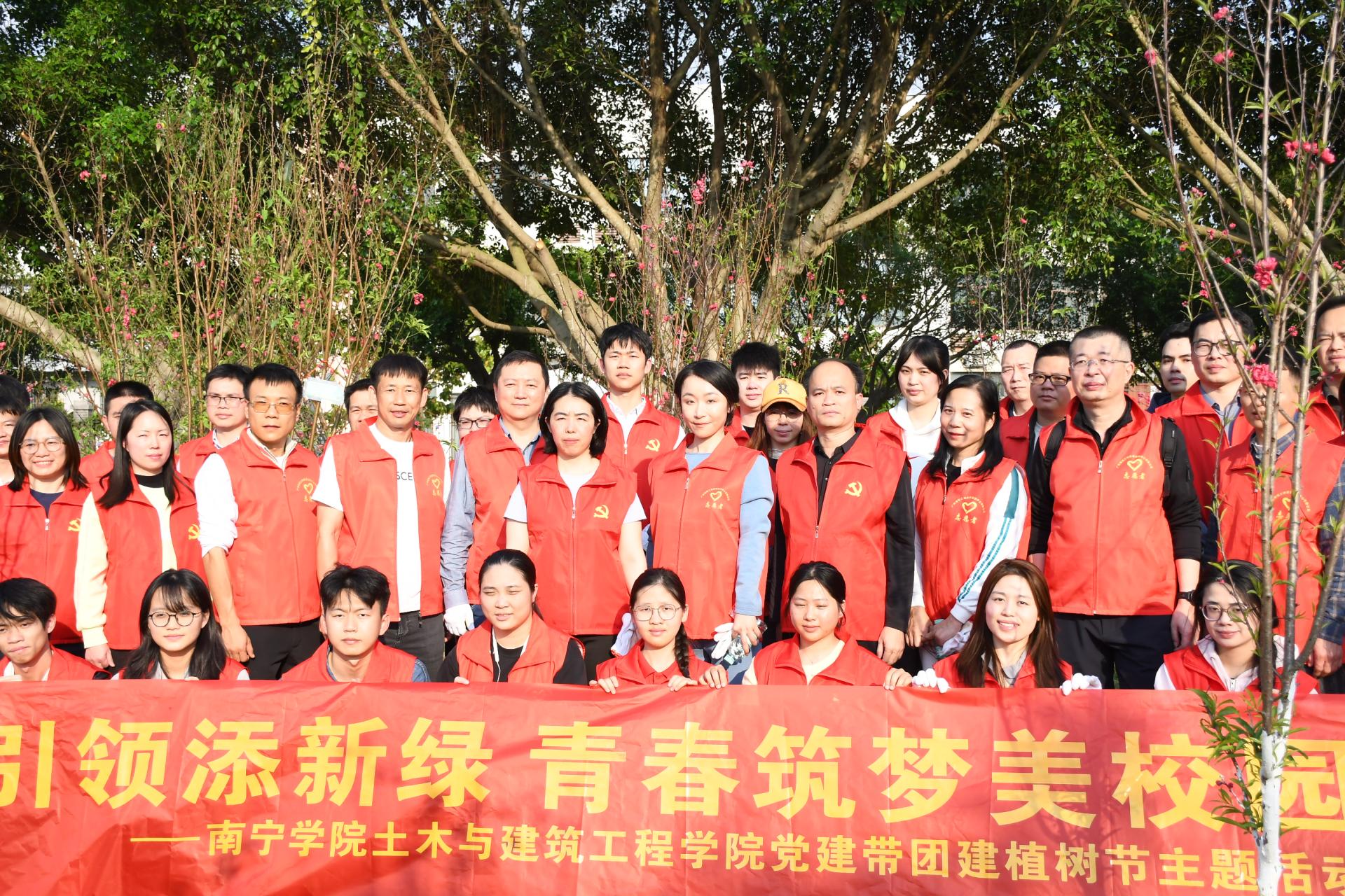 为深入学习贯彻习近平生态文明思想,践行“绿水青山就是金山银山”的发展理念,响应国家“双碳”战略部署,深化校企共建联建,2026年3月12日下午,土木与建筑工程学院党委联合广西建筑工程质量检测中心党委、校党委组织部共同开展 “学雷锋志愿服务植树主题党日暨‘校企同心植绿土,智能检测创未来’联学联建活动”。广西建筑工程质量检测中心党委副书记、工会主席朱莉,学院党委书记、执行院长沈建增,校党委组织部副部长唐梅参加活动。