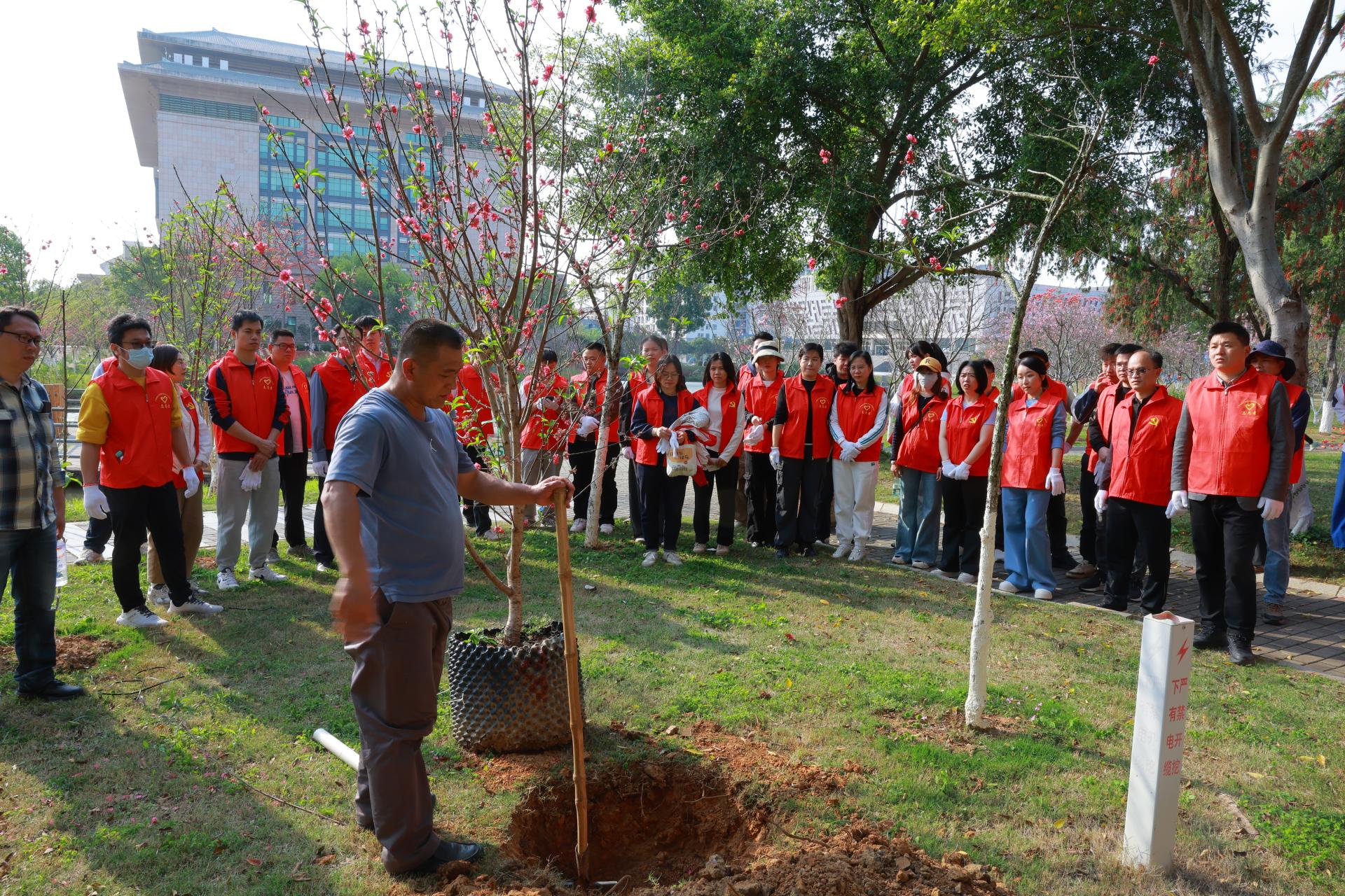 在不孤湖畔植树点,工作人员为大家讲解植树知识与操作步骤。校企双方党员代表、技术骨干、青年团员们分工协作,挥锹铲土、扶树填坑、提水浇灌,合力栽下一株株碧桃树。