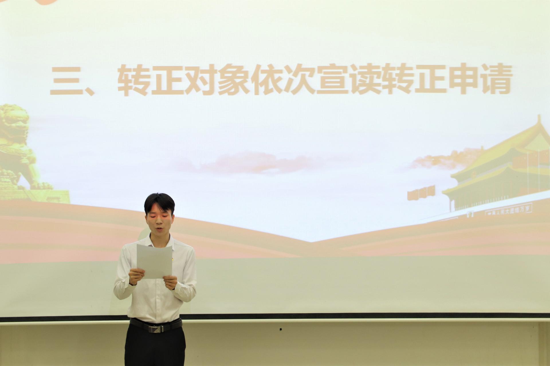 此次会议由秦任权等23名同志提出转正申请。按照党员转正规程,由秦任权等23名预备党员逐一上台宣读转正申请书并汇报近期思想情况,表明了对党的向往与忠诚,汇报了他们在一年的预备考察期间思想、工作、学习等方面的进步和自身存在的不足。党内同志认真倾听,并给予诚恳建议。经正式党员同志的无记名投票方式表决并宣布结果,本次23名同志如期转为中国共产党正式党员。