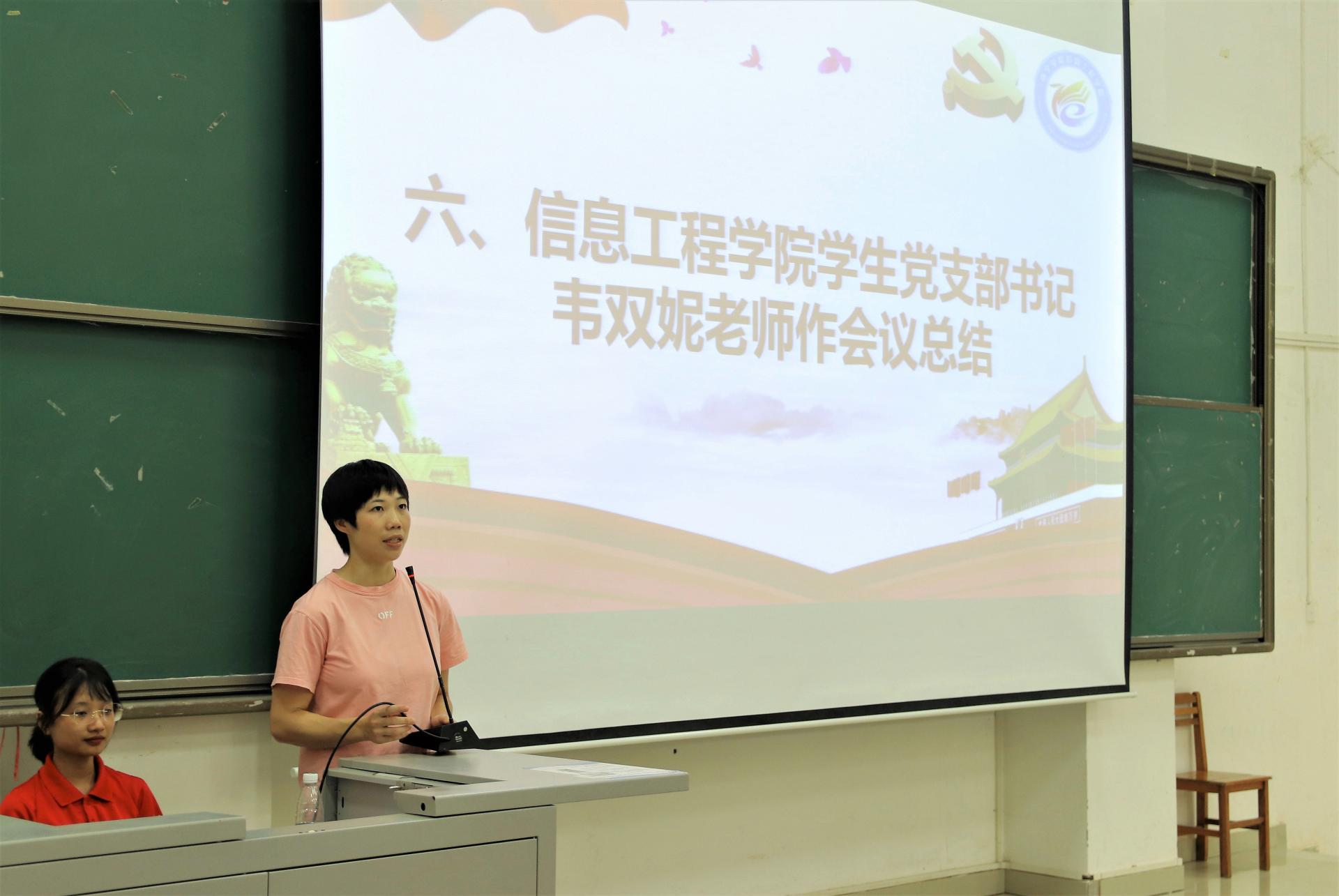 6月7日下午,信息工程学院学生党支部预备党员转正大会在敷文园C-104召开。学院学生党支部书记韦双妮老师,辅导员杨帆、杨昌俊、叶星彤、杨婧、陈家兴老师出席大会,学院学生党支部全体在校党员和预备党员参加此次会议。本次大会由谢怡雯同志主持。