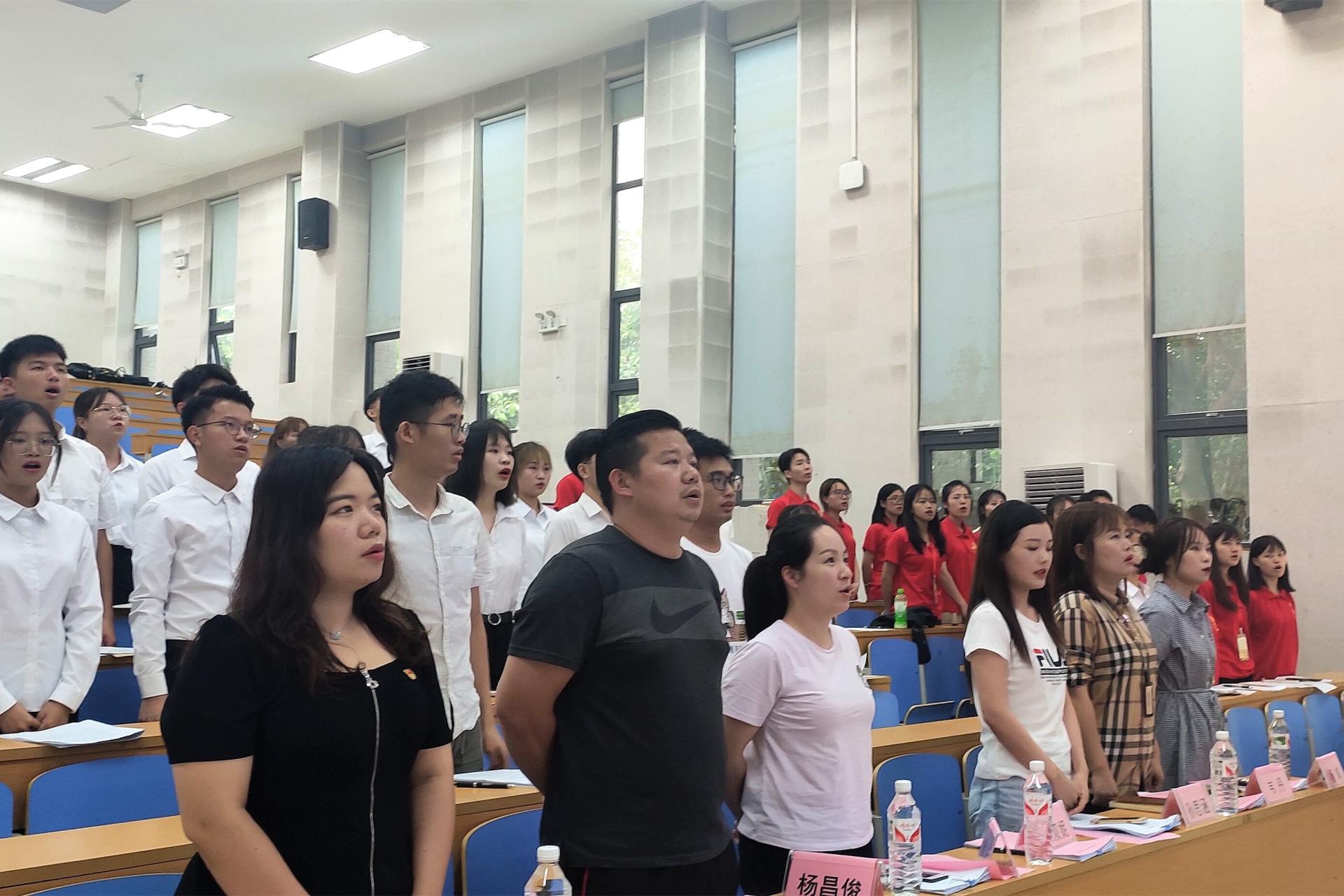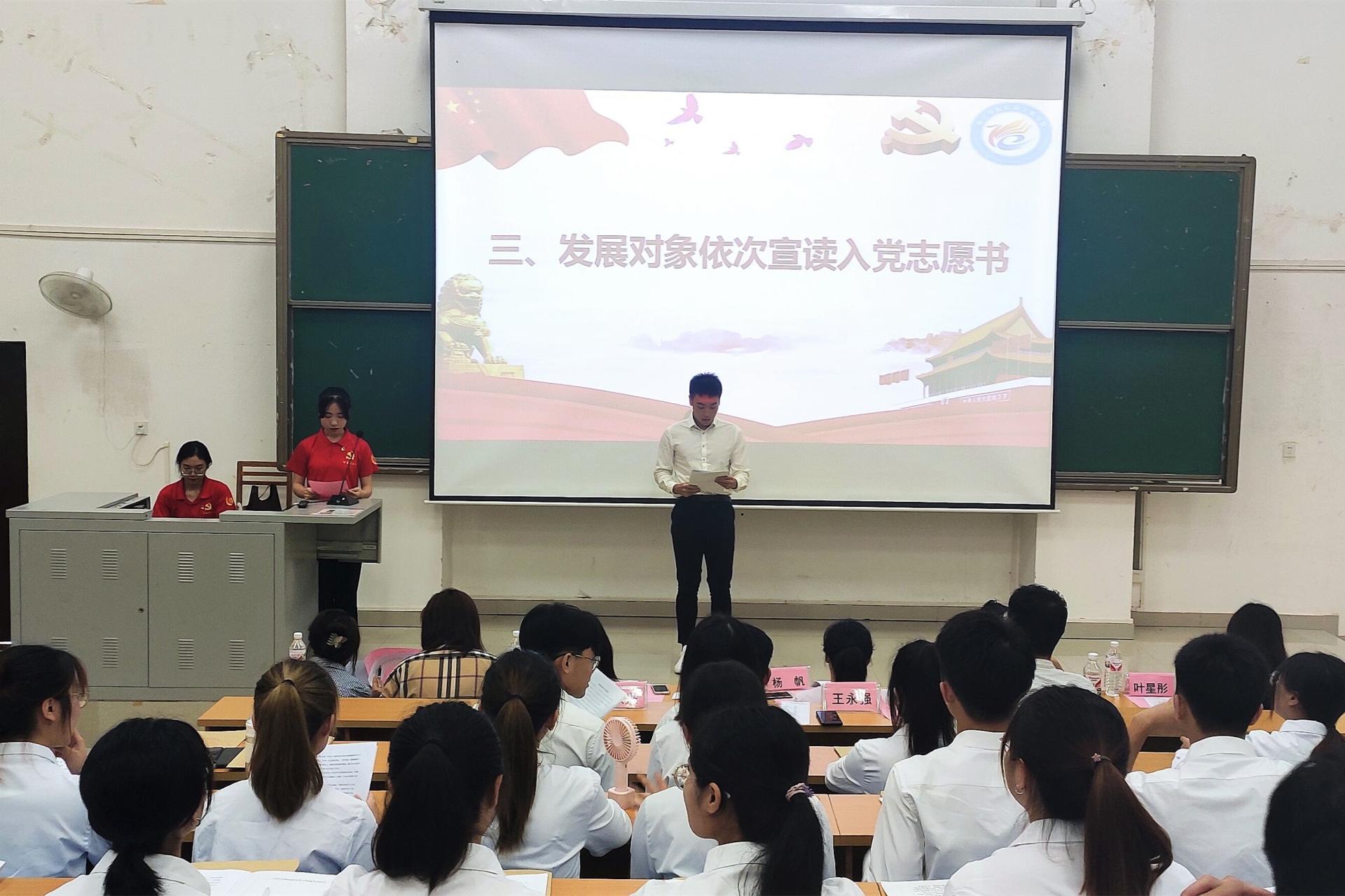 会上,全体起立奏唱中华人民共和国国歌,随后主持人介绍本次发展大会的规程和要求。各位发展对象依次上台作思想汇报,入党推荐人为发展对象发表推荐词,并由入党介绍人对发展对象在发展期间的表现发表意见及建议。发展对象认真倾听,并积极接受党员同志的建议。经正式党员同志的无记名投票方式表决并宣布结果:与会的正式党员同志一致同意许雪妮、吴宗霖等35名同志如期转为中国共产党预备党员。全体成员在入党誓词中表达了自己对于党的敬仰之心和奉献自己的决心。