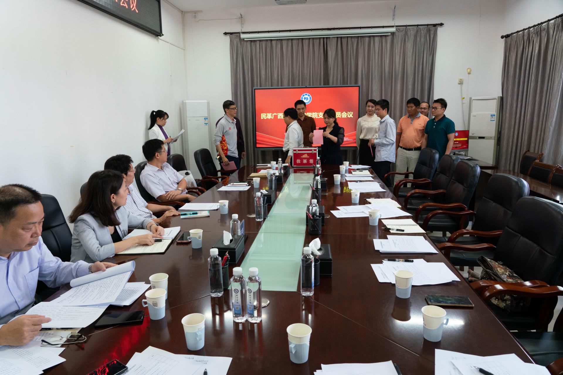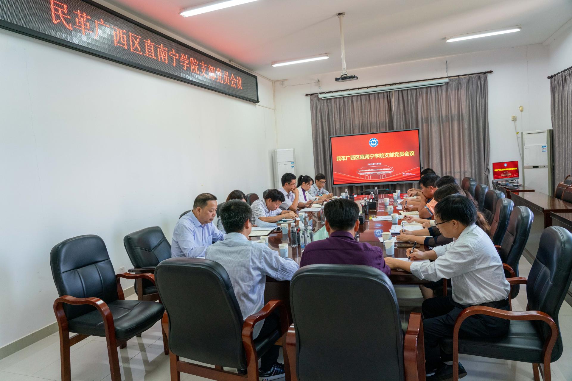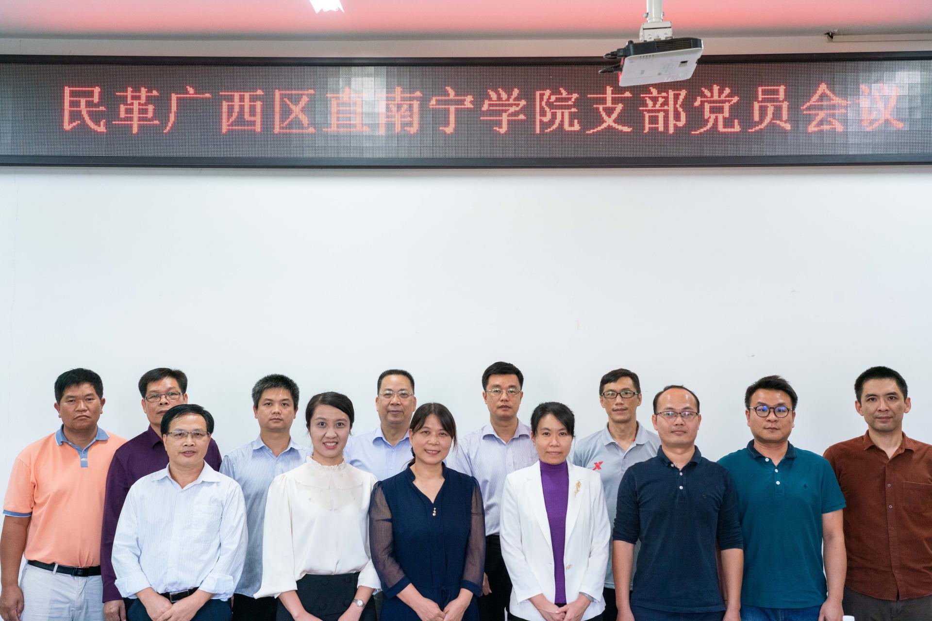 2022年11月8日下午,民革广西区直南宁学院支部在学校行政楼518会议室召开换届大会。民革广西区委会副秘书长兼组织部部长钟俊军,组织部副部长许冰,学校党委副书记、纪委书记覃存民,统战部部长赵田英出席会议,支部全体党员参会。大会由支部主委卢玉光主持。