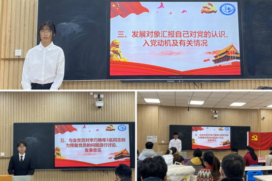本次发展大会对李巧艳等3名同志是否吸收成为预备党员进行充分讨论。首先,李巧艳杨正坤、刘济坚同志依次汇报自己在培养考察期间的思想、学习、工作、生活等情况随后,入党介绍人和与会党员对发展对象的表现发表意见,发展对象认真听取意见并作表态。经与会正式党员的无记名投票方式表决并宣布结果,票数统计超过与会党员的三分之二,本次表决有效,同意学生第一党支部李巧艳同志学生第二党支部杨正坤、刘济坚同志吸收成为中国共产党预备党员。