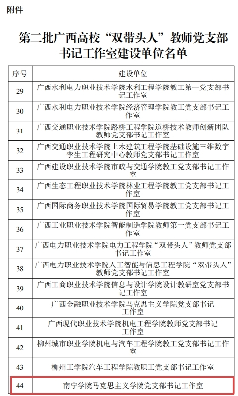 近日,自治区党委教育工委公布了第二批广西高校“双带头人”教师党支部书记工作室建设单位名单,我校马克思主义学院党支部书记工作室在众多候选单位中脱颖而出,成功入选。