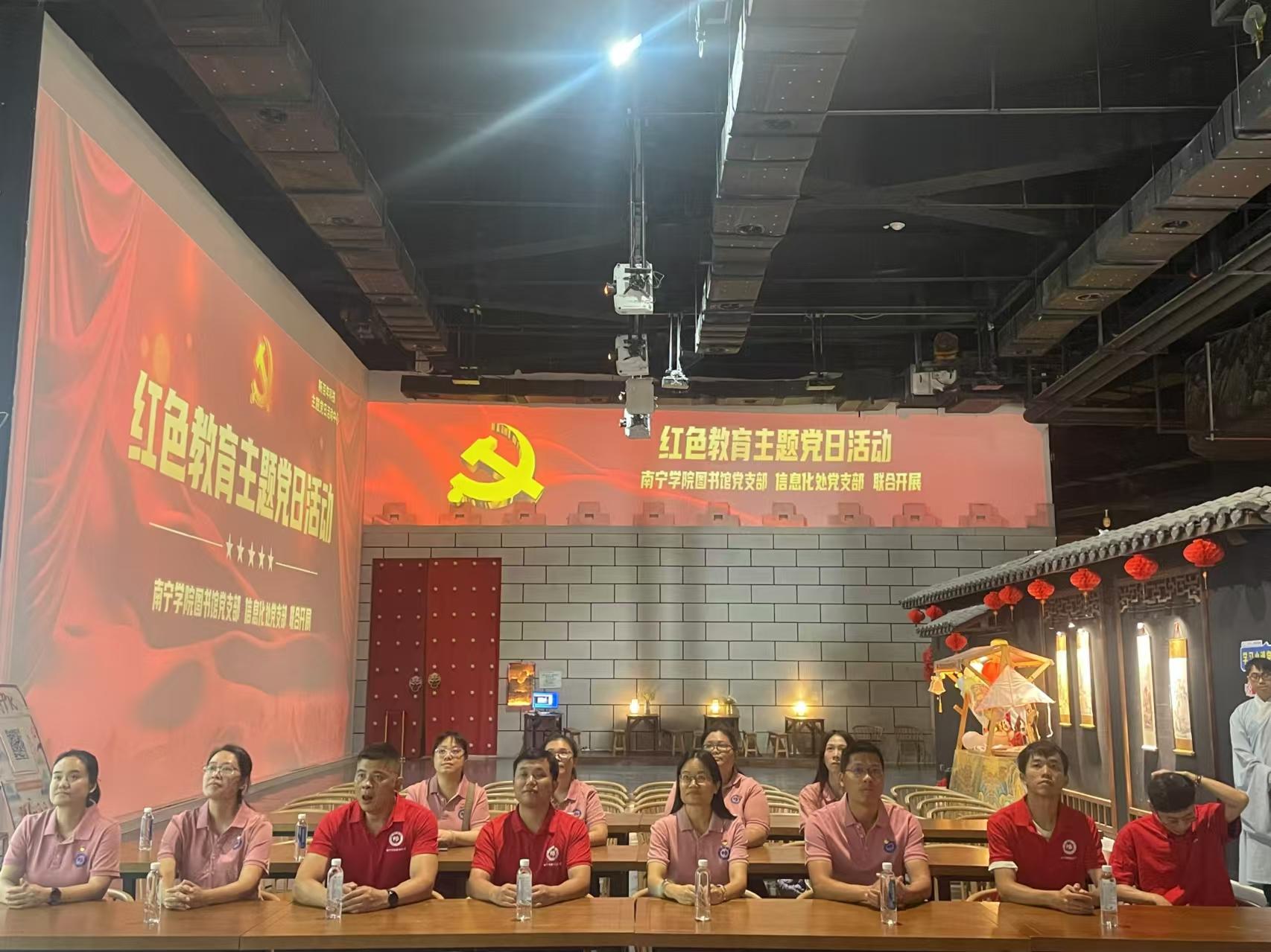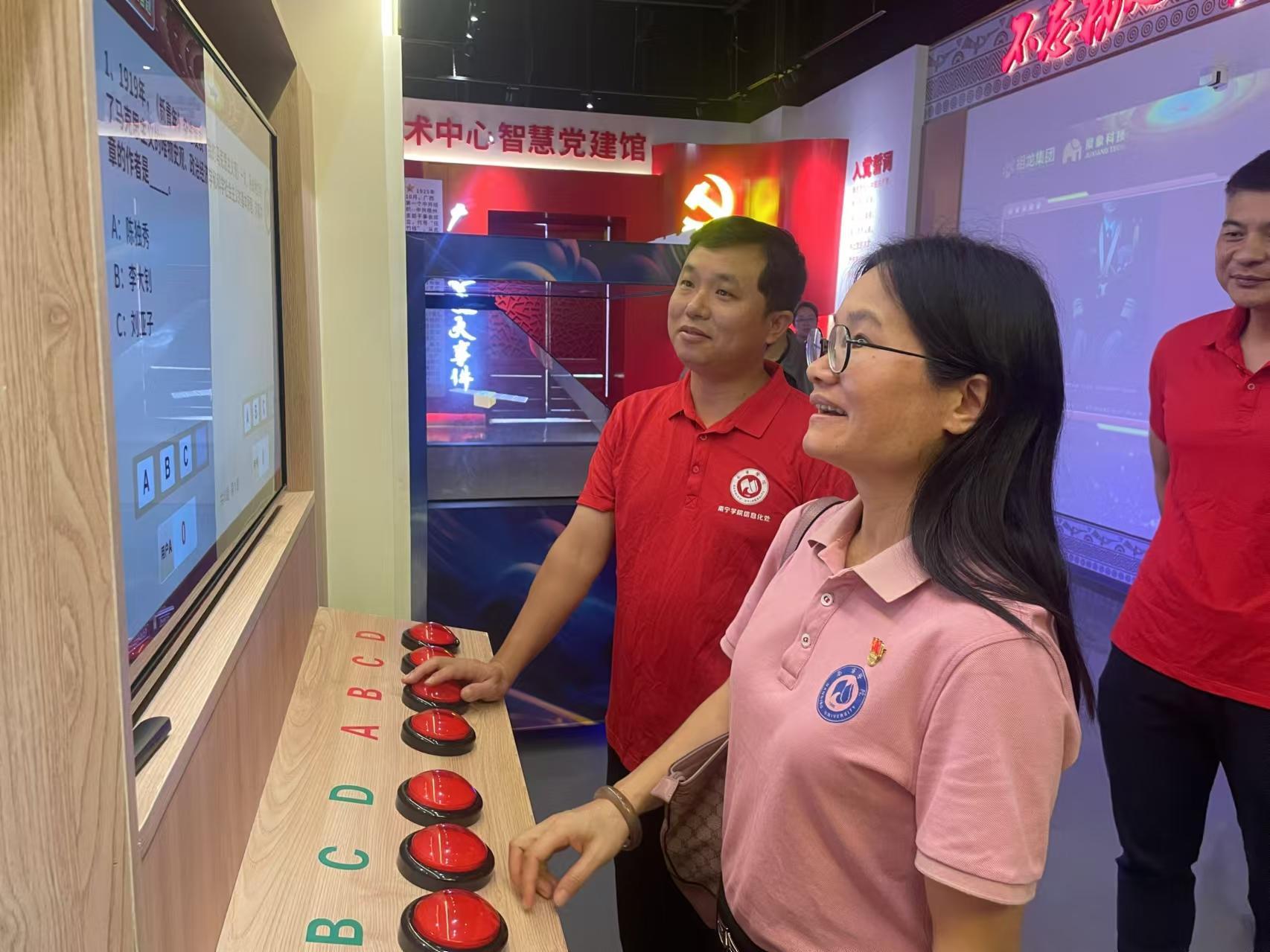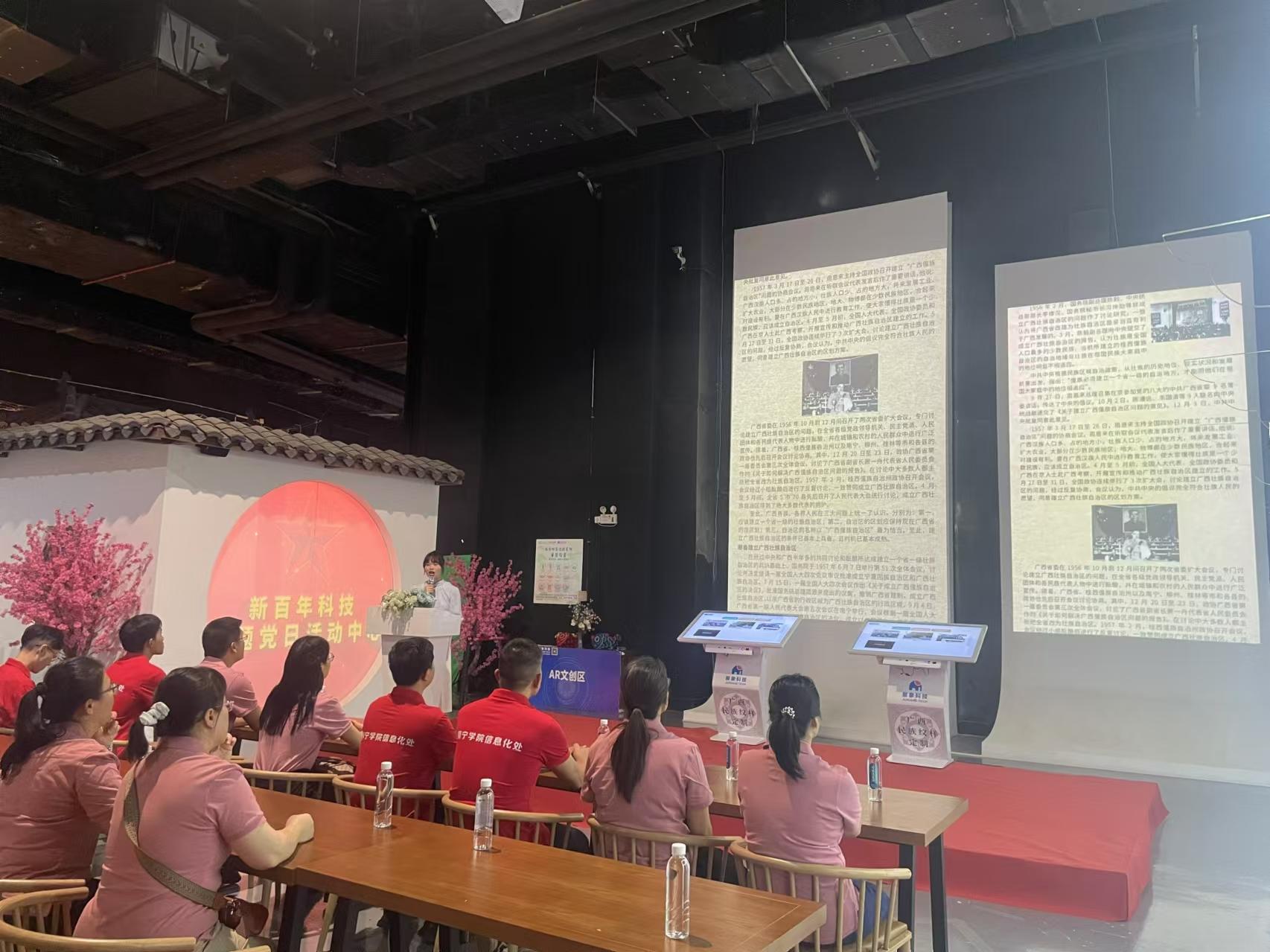 为深入学习贯彻党的二十大精神,充分发挥党建共建互融互促,2024年10月31日下午,图书馆党支部与信息化处党支部共赴五象新区祖龙AC MALL购物中心8楼的新百年科技主题党日活动中心,联合开展了一场别开生面的红色教育主题党日活动,包括“党在我心中”、“追忆红色历史”“传承红色基因”和“清明上河图艺术展”等四个环节。此次活动旨在通过科技与历史的深度融合,让党员们身临其境地体验党的光辉历程,进一步坚定理想信念,激发担当精神。
