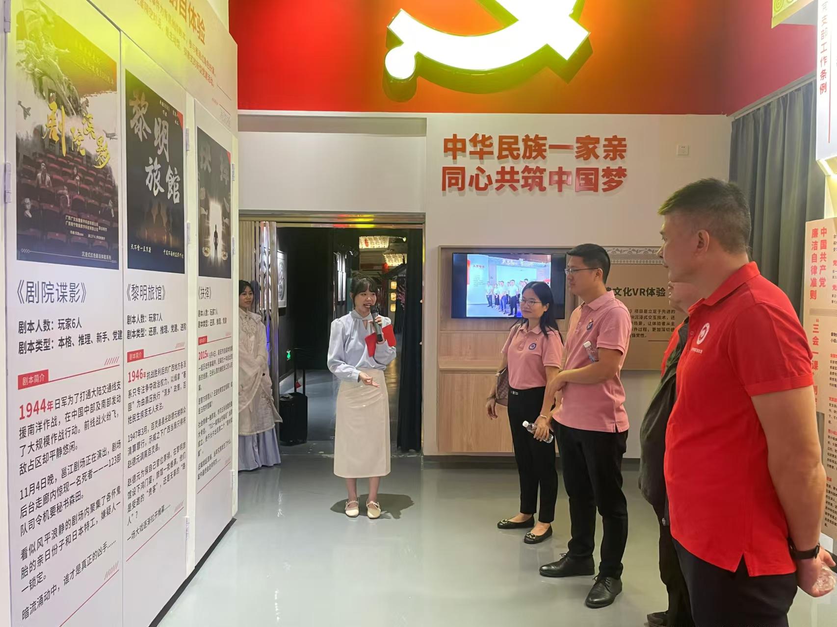 “传承红色基因”环节,解说员引领党员们参观了位于AI智慧党建展示馆的“在烽火中建党”主题展。通过“党建文化VR体验” “党史问答PK赛”“红色光影图书”“红色文化全息互动展示”等数字科技互动体验项目,党员们身临其境地体验了中国共产党发展历程,深刻感受到了红色革命文化的深厚底蕴,了解了先进数字科技在红色文化传承中的重要作用。