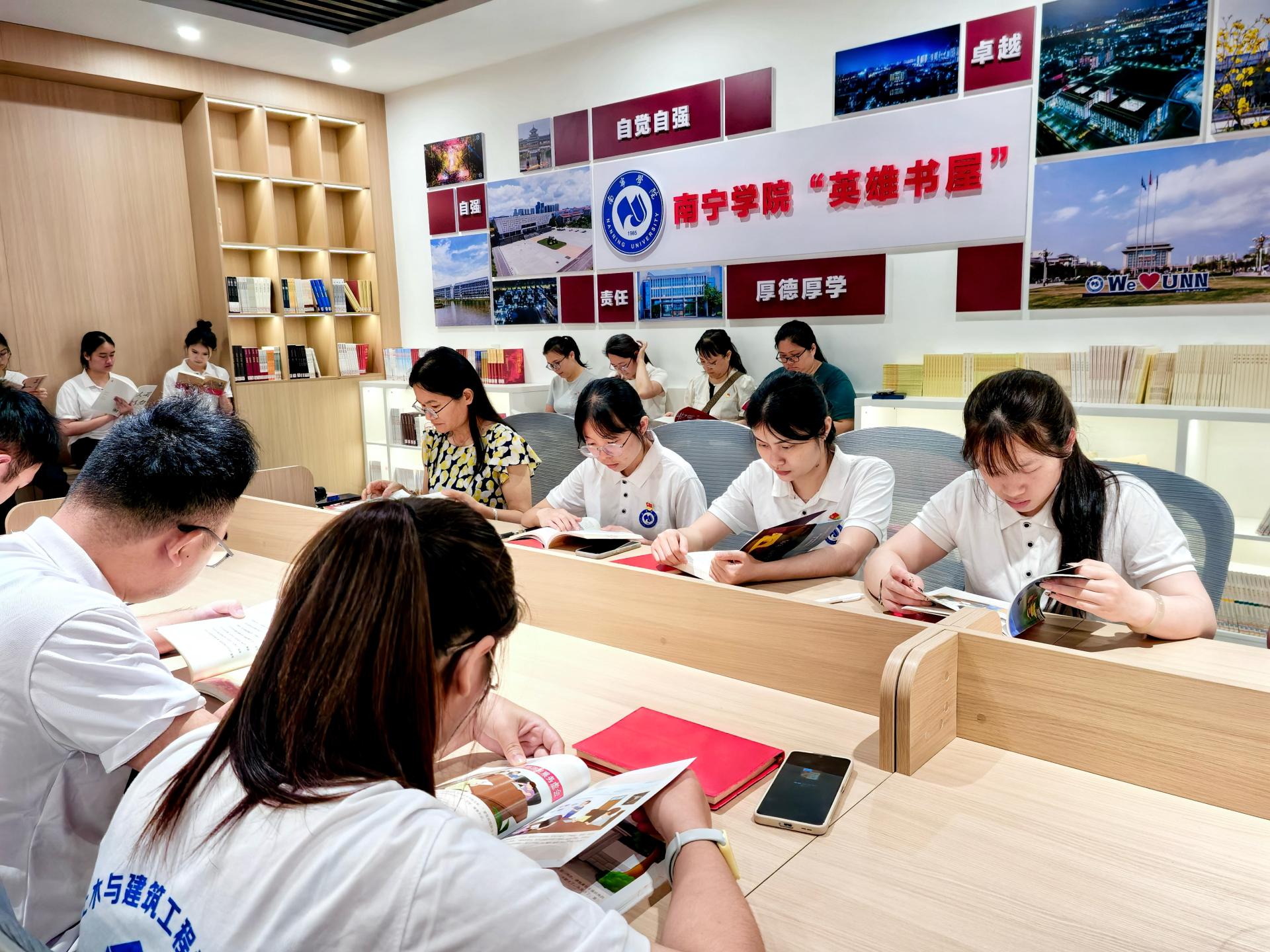 为深入贯彻习近平文化思想,落实立德树人根本任务,推进党建+业务深度融合,引导党员师生深入理解红色文化内涵,传承红色基因,厚植家国情怀,2025年5月13日下午,南宁学院图书馆党支部联合马克思主义学院教工第一党支部,在南宁学院英雄精神传承体验馆联合开展“探寻英雄足迹,品读红色青春”主题教育实践活动。本次主题党日暨阅读实践活动构建了“观、读、述、悟”四位一体教育模式,通过参观英雄精神传承体验馆展陈,实现英雄精神的具象化感知;运用沉浸式阅读的形式,还原红色经典场景。同时,图书馆党支部书记通过分享红色经典书籍,搭建学习交流平台,鼓励学生对话历史,激励青年学子以英雄为榜样,从经典中汲取奋进力量,勇担青春使命。