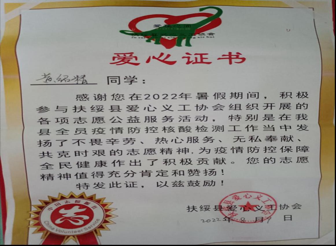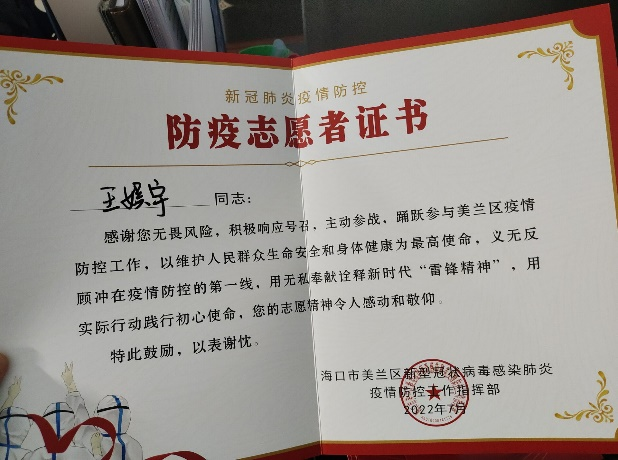 作为一位新时代青年的大学生,她心中有一份想要报效祖国的决心,海南省在本次暑期爆发了严重的疫情,2021级工商管理3班王娱宇同学积极参加抗疫志愿服务,她与社区的基层工作者们一同工作,日夜排查监管,做着疫情防控中最基础、最重要的一环。她说:“我认为社会责任感是每个人必须具备的,因此我选择去参加社区基层的志愿者,为防控疫情贡献着自己的力量。如此渺小的我终于也能为疫情献出自己的一份力。同时通过这项服务我也锻炼了自己与人交往的能力,更收获了许多温暖,每一句相互慰问,每一次行人们的努力配合,就足以给工作中的我带来了极大的幸福和满足,我认为我的工作是非常神圣而有意义的!”