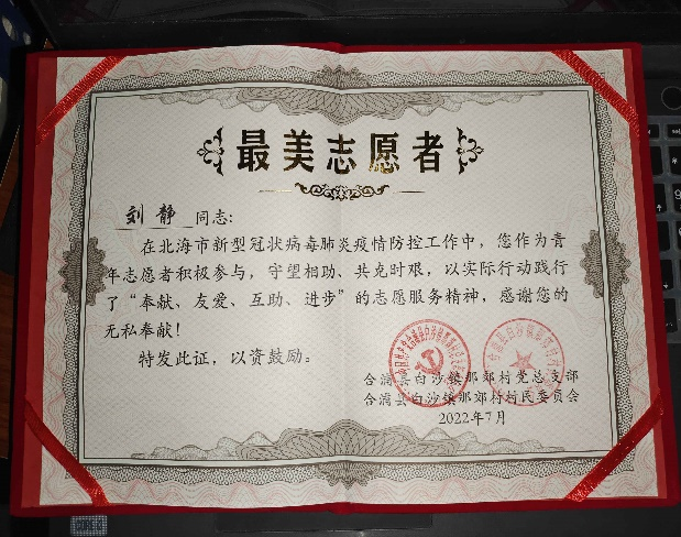 “作为我们学校志愿者的一员,我理应以身作则,很荣幸能够为家乡尽一点绵薄之力,这样既展现了我们学校的志愿者风采,又为家乡做出了实际的贡献。”来自2020级会计学1班的刘静同学在合浦县团委、白沙镇党委以及政府的号召下,她和同是那郊村委的其他大学生积极响应号召,立即参与到全村委的疫情防控工作中,为了在疫情防控一线展现着新时代大学生志愿者的风采,她们组成了村里的志愿者服务队,共同参与了乡镇里组织的疫情防控工作。她表示:这次抗疫志愿活动对她影响巨大,不仅提升了社会能力,增加了社会经验,还加强了她解决问题的能力。青春无限,意在奉献,以小我融入社会之大我,奉献我们的光和热,让当代大学生的青春之火燃烧在社会的每一个角落,永不熄灭,温暖每个人的心田。