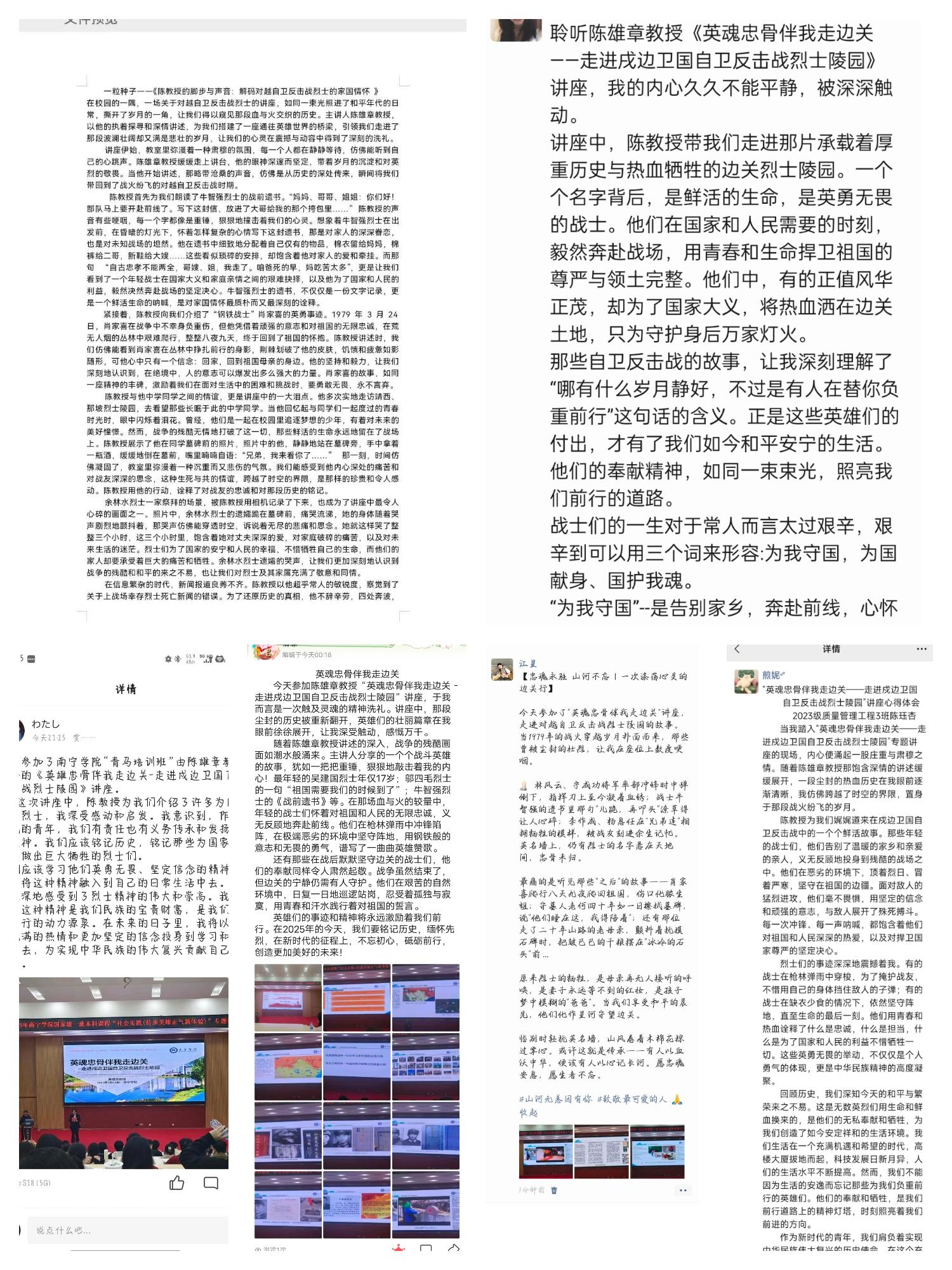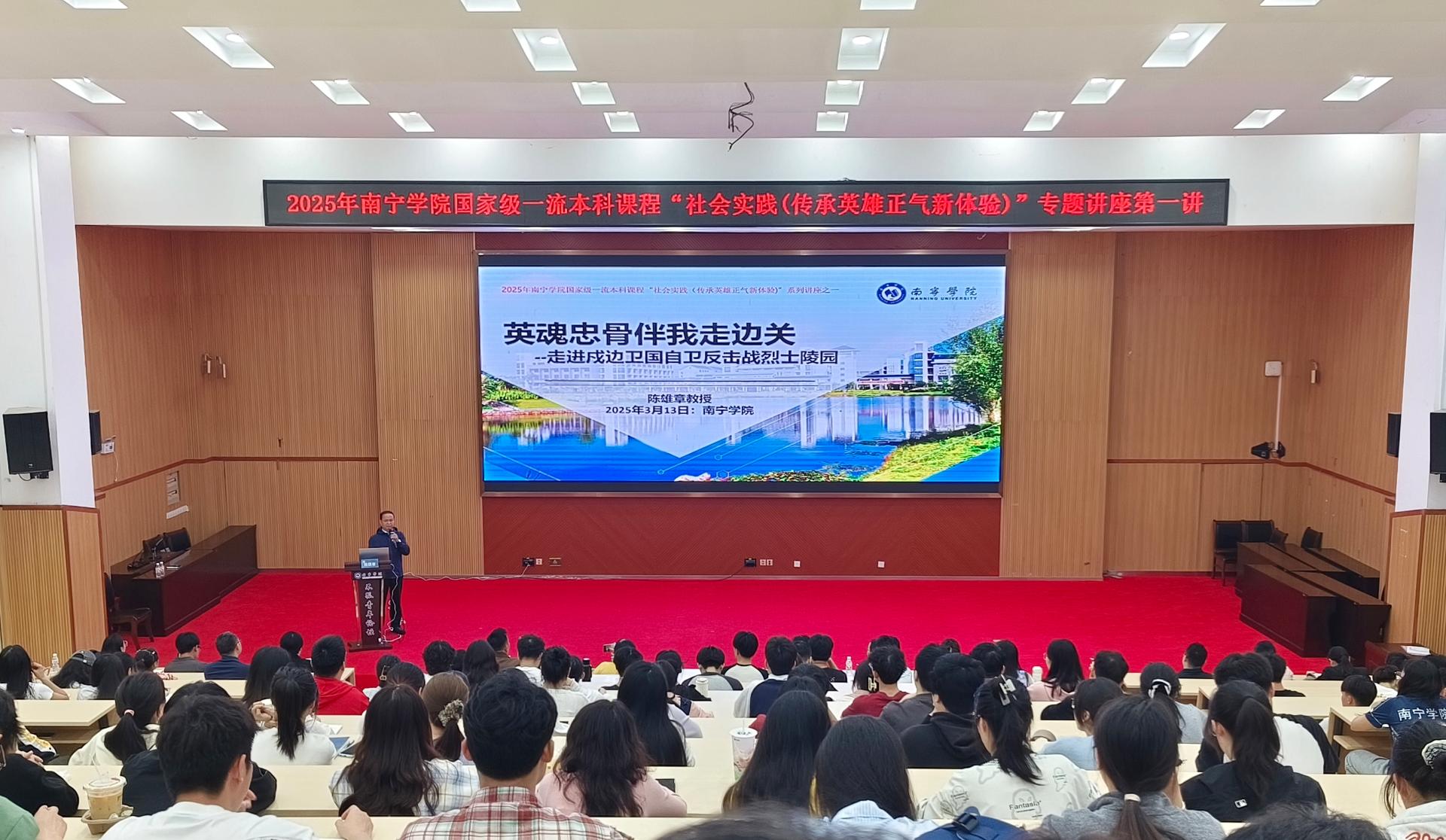 为缅怀戍边卫国烈士的英雄事迹,传承先烈遗志,纪念戍边卫国自卫反击战胜利46周年,3月13日晚,南宁学院国家级一流本科课程“社会实践(传承英雄正气新体验)”课程团队,在大学生活动中心103举办“英魂忠骨伴我走边关——走进戍边卫国自卫反击战烈士陵园”专题讲座。讲座由课程团队负责人陈雄章教授主讲,马克思主义学院副院长张雪娇主持,南宁学院两百余名师生代表参加。