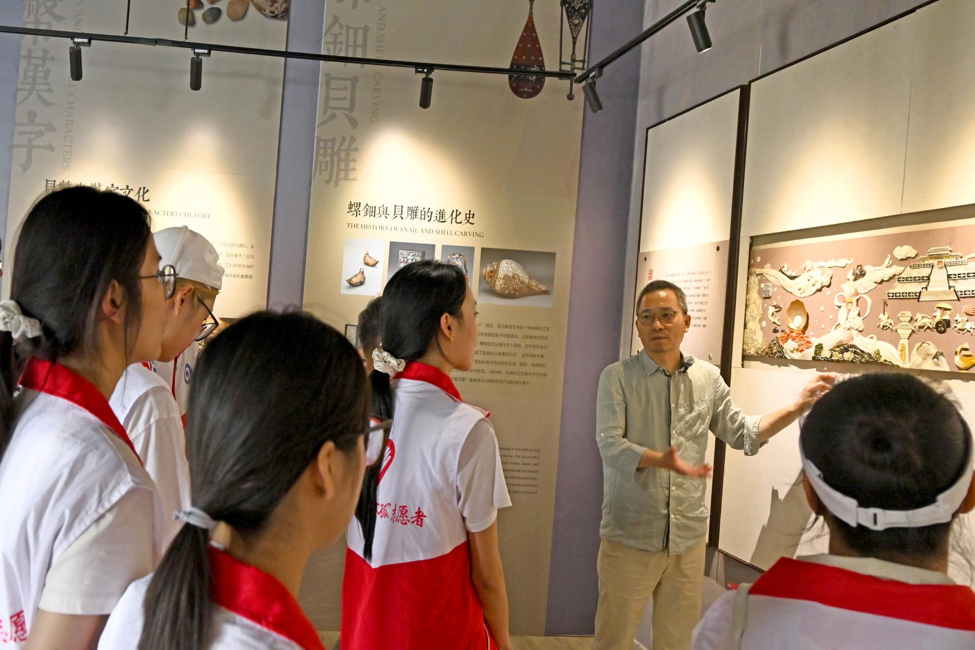 博物馆讲解员讲解贝雕的历史脉络