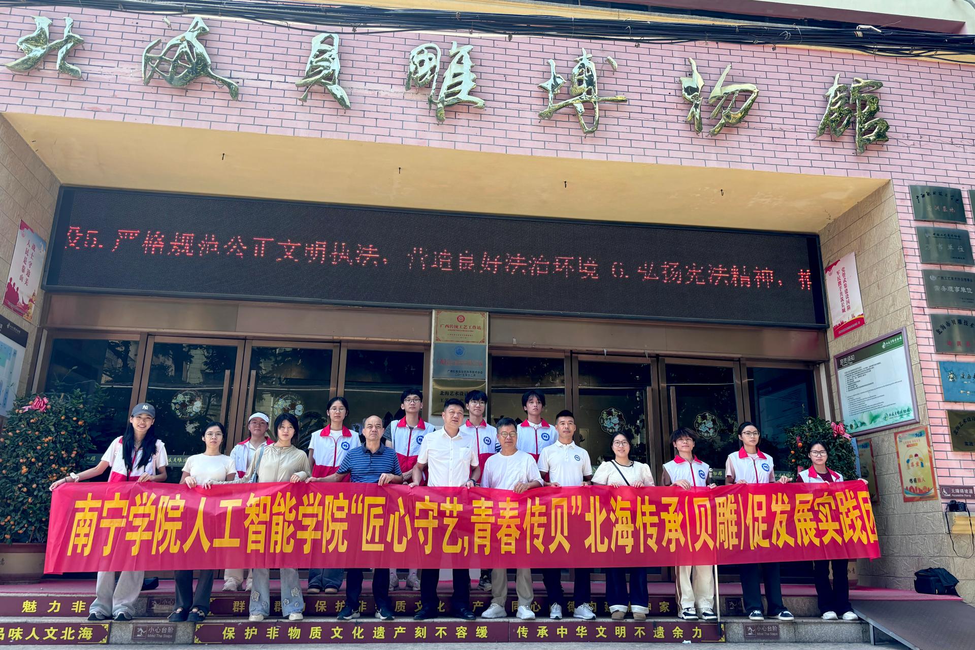 7月7日上午,人工智能学院“匠心守艺,青春传贝”实践团成员在学校南门广场整装集结,怀揣着对非遗文化的敬畏与热忱,奔赴北海贝雕文化传承地开启一场意义非凡的贝雕文化传承实践征程。此次实践活动旨在以贝雕为纽带,深度融合人工智能专业优势,探索非遗传承新路径,为千年贝雕技艺注入青春活力。