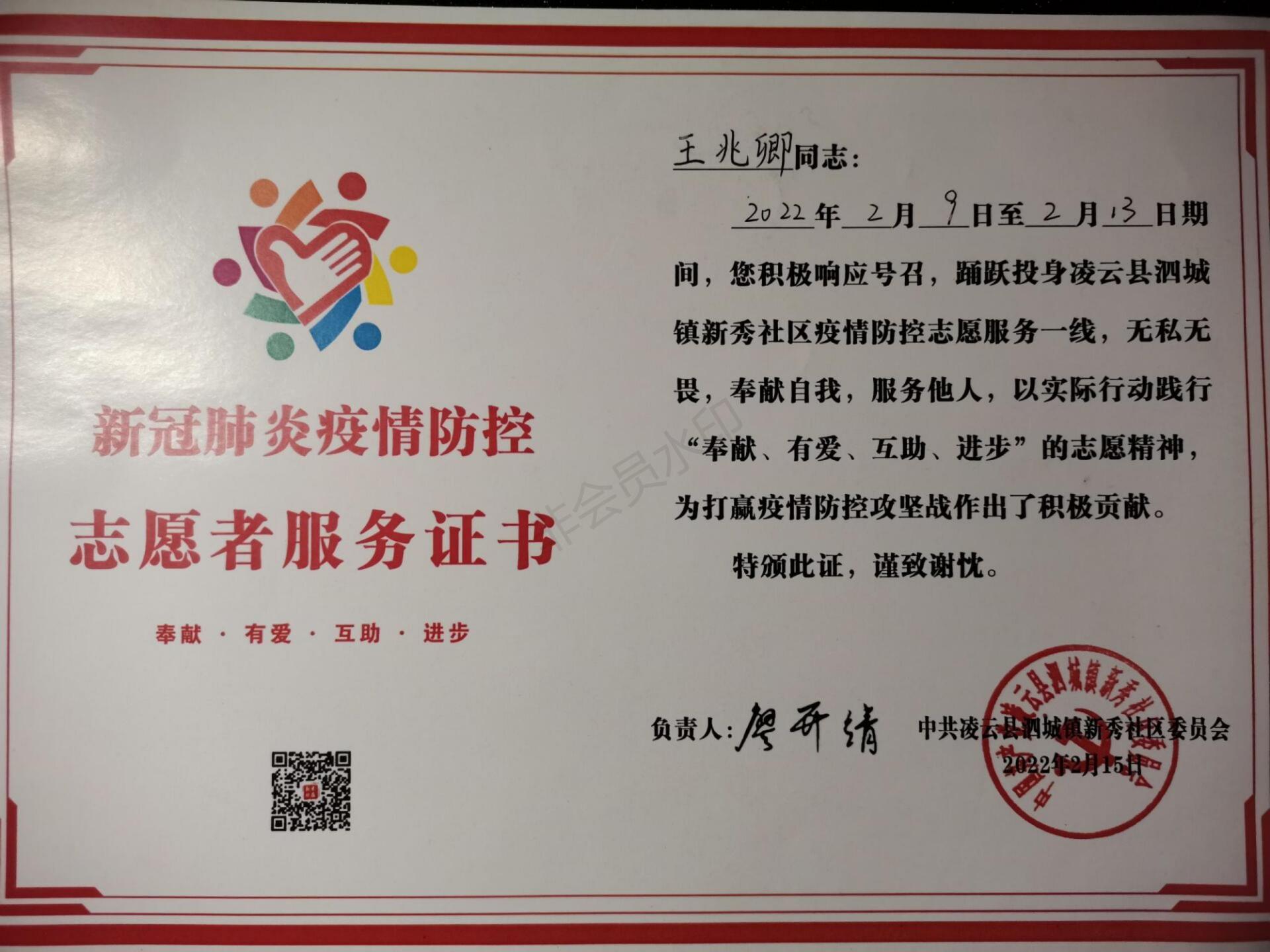 王兆卿志愿者服务证书
