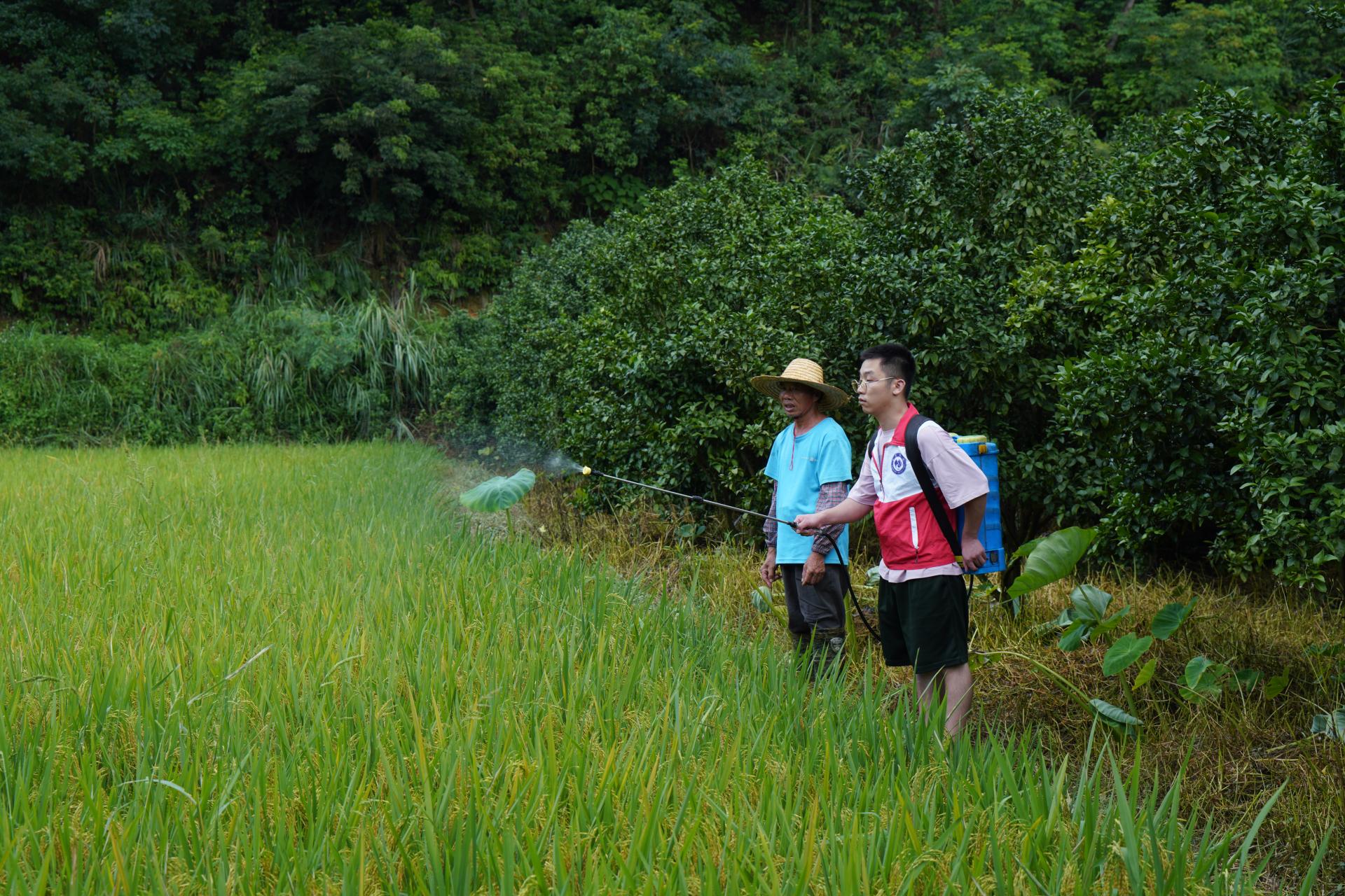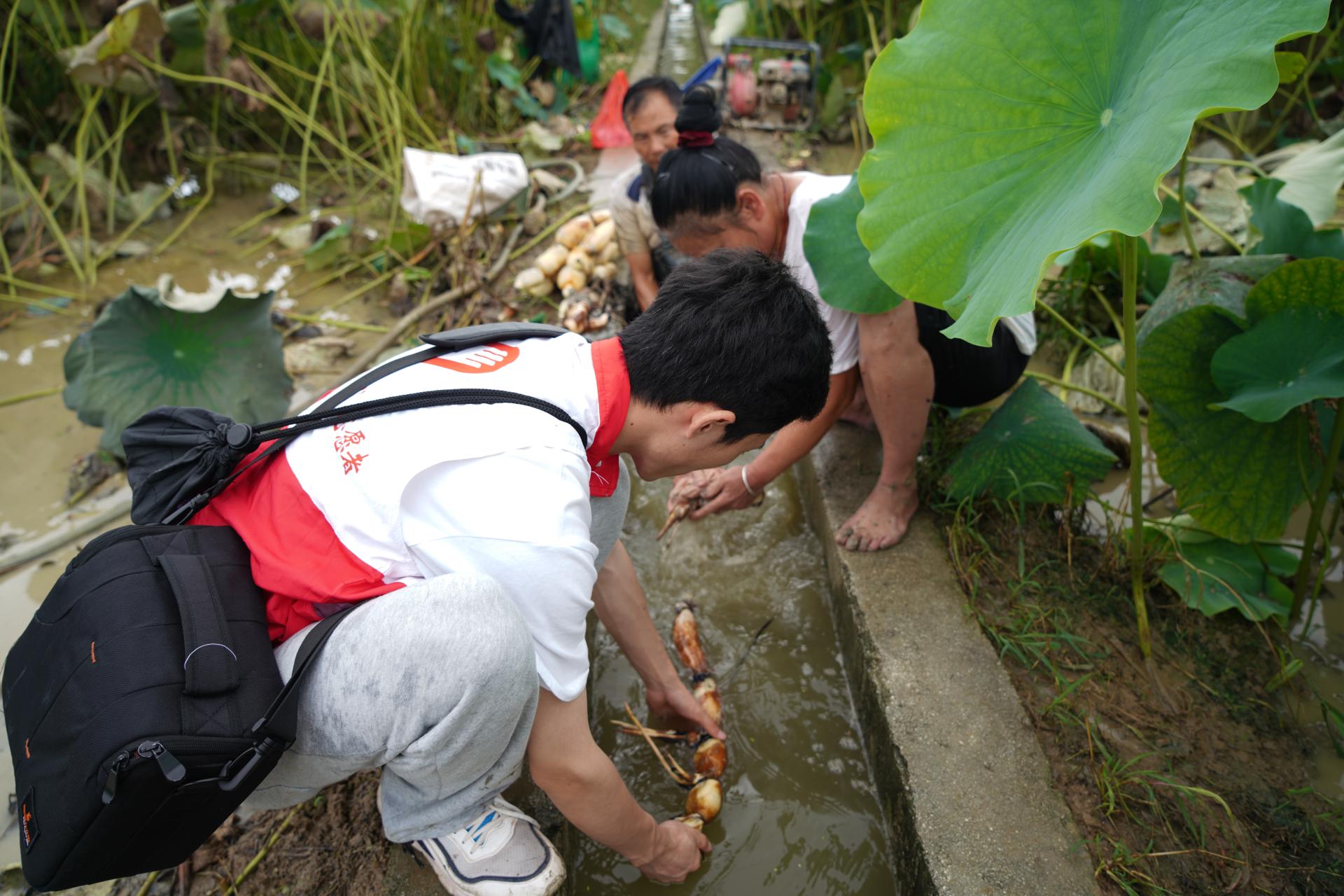 上午7时,实践团成员来到兴隆村莲藕种植区拍摄村民邓伯挖莲藕的劳动场景,并亲身体验了田间劳动。据邓伯介绍,他自己承包14亩土地进行莲藕种植,目前7月份是当地莲藕收获的季节。他早上7点多就起来挖莲藕,下午拿到集市售卖,自己种植的莲藕粗大饱满、香脆爽口,拿到集市售卖都是供不应求。实践团成员在田间帮助邓伯清洗莲藕,在劳作中培养实践技能,领悟到劳动教育的重要性。实践团成员胡兵说到“这是我第一次走进田间参加劳作,这是一次新体验,让我真正感受到农民种植粮食非常不容易,我们青年大学生一定珍惜现在的幸福生活,艰苦奋斗,节约粮食,杜绝浪费。同时,我们也要积极参加各类劳动教育,在劳作中长才干、增本领、悟思想”。下午,实践团成员来到水稻种植区拍摄取材,并参加田间劳作,协助村民施肥和喷洒农药杀虫。