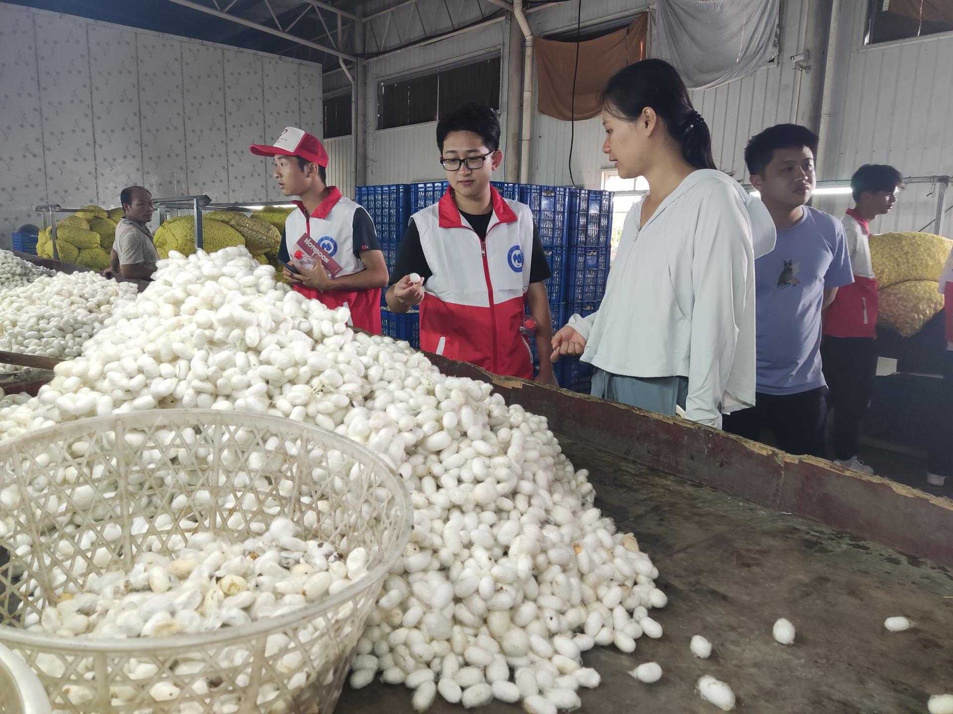 随后发展成就观察团成员跟随雷厂长来到了生产车间,一起观摩学习生产蚕丝的每一道工艺,观察团成员向工人们询问请教每一道工序的要求和方法,并参与到生产中,学习体验蚕丝工艺。